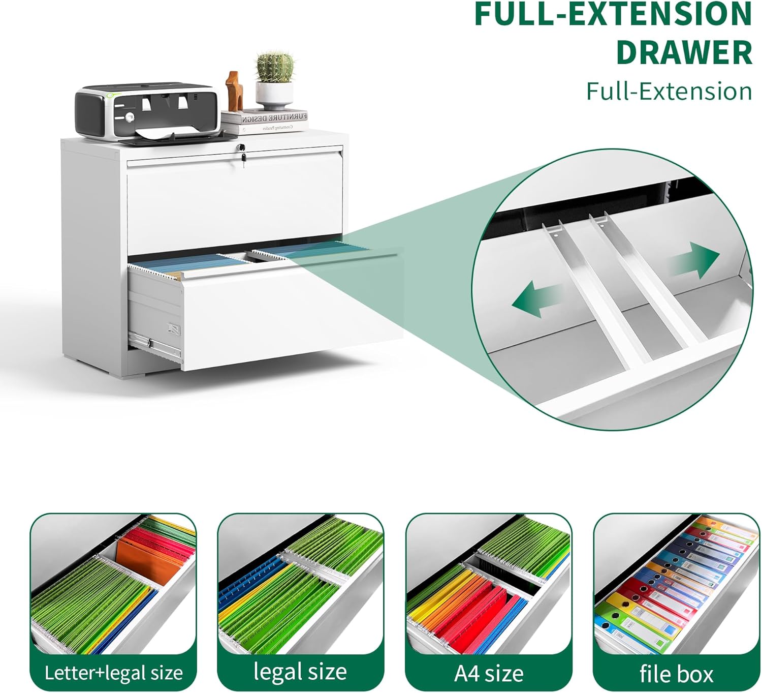 - 【Humanized Design】This 2-drawer filing cabinet has ball bearing fully floating drawers for smooth, quiet opening and closing. This friendly feature enhances convenience and minimizes disruption in the office environment.