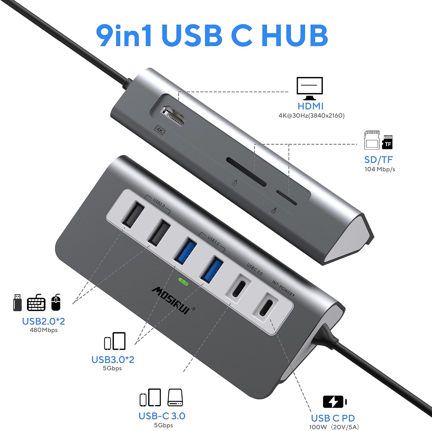 USB C Hub Multiport Adapter,Mosirui 9-in-1 USB-C Docking Station with 4K HDMI,5Gbps Type C 3.0,USB-A3.0/2.0,100W PD, SD/TF for MacBook/Pro iPad/Dell/HP/Desktop/Laptops(50CM)