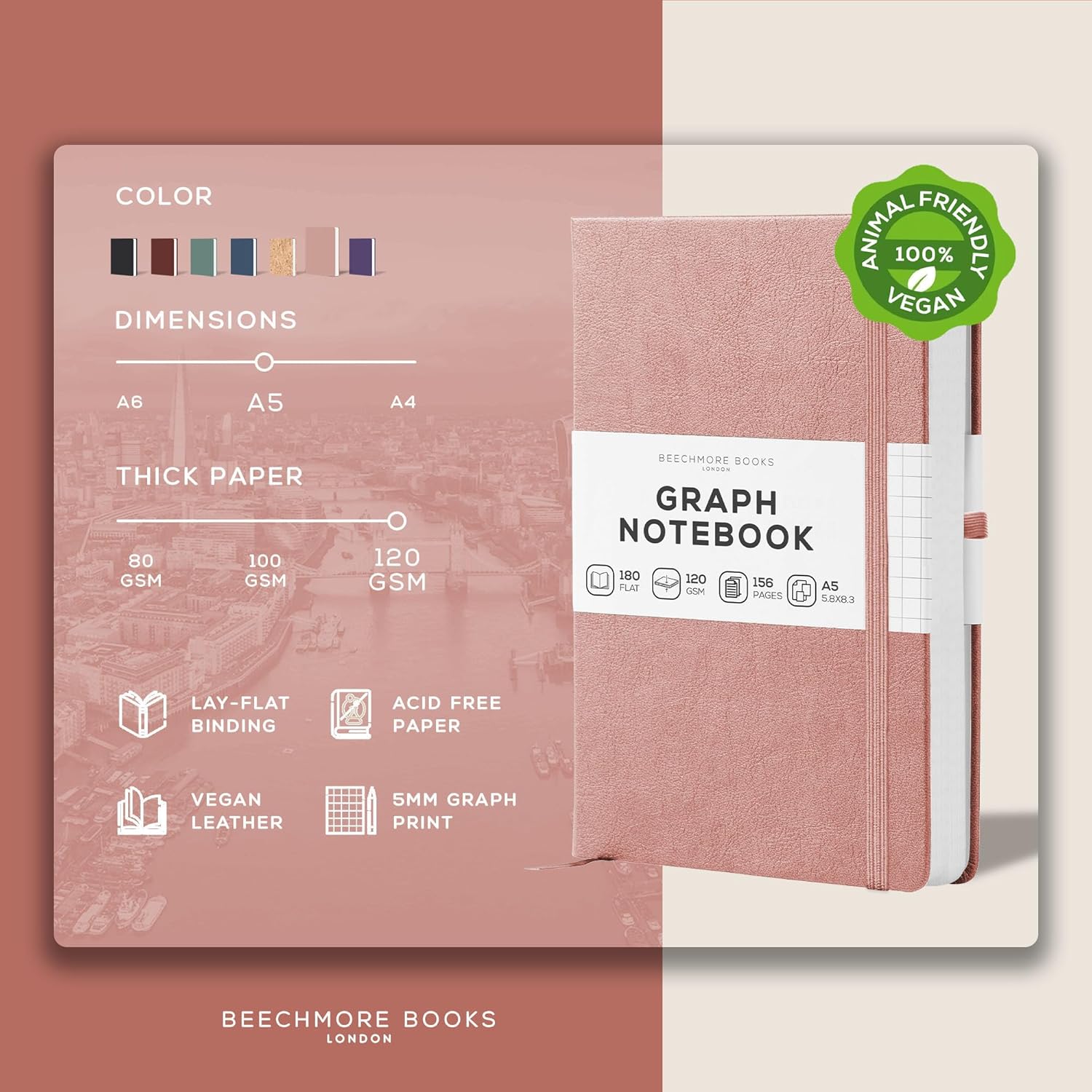 BEECHMORE BOOKS Graph Paper Notebook - Regular, Pink | Premium Square Grid Math & Science Journal | 5.75" x 8.25" Hardcover Vegan Leather | Thick 120gsm Cream Graph Paper | Gift Box for Men & Women