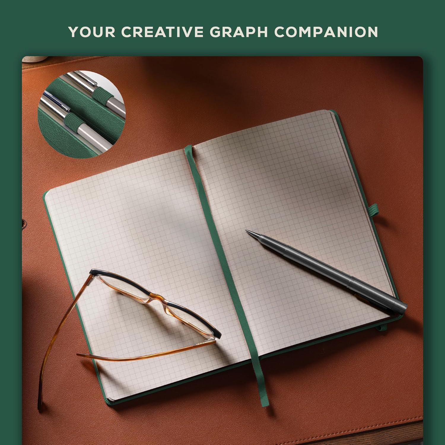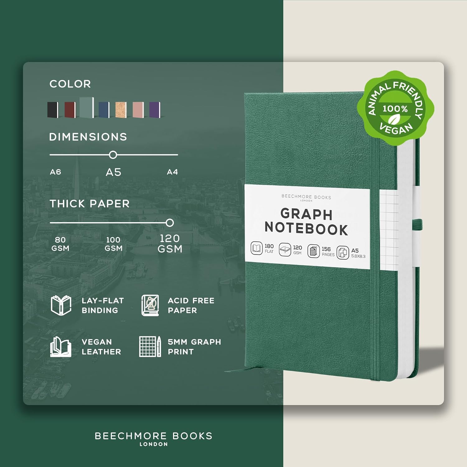 BEECHMORE BOOKS Graph Paper Notebook - Regular, Green | Premium Square Grid Math & Science Journal | 5.75" x 8.25" Hardcover Vegan Leather | Thick 120gsm Cream Graph Paper | Gift Box for Men & Women
