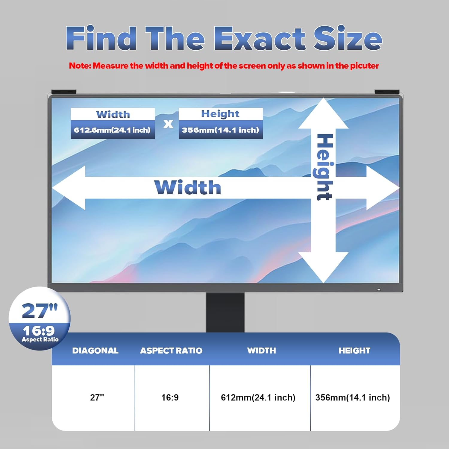- Perfect for 27 Inch Monitor : The computer privacy screen filter perfectly fits for 27 inch widescreen monitor with an aspect ratio of 16:9. To determine the right size of your screen, measure the height and width of your screen without the boarder. If you have any problems with the size, please contact us directly