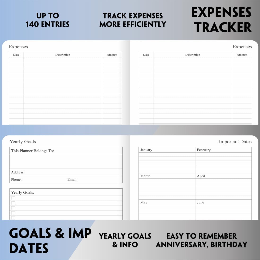 - Major holidays listed, yearly goals, important date pages, website password, address, expense, and notes pages