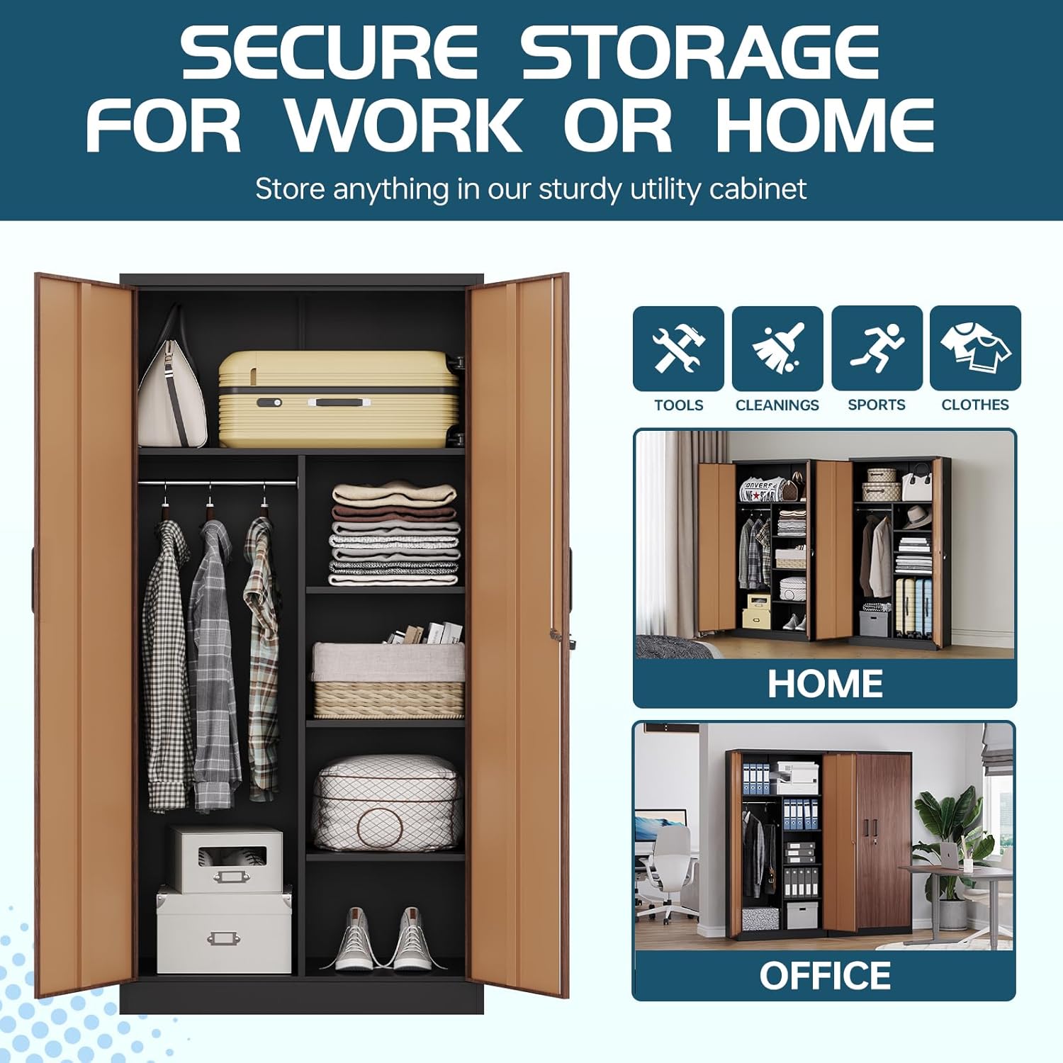 - 【Multi-use Metal Locker Cabient】 This Multi-use metal locker will upgrade the look and organization of your office, garage, basement, workspace and laundry room. Built with heavy-duty steel frames for added strength, these cabinets are ideal for storing sports equipment, tools, cleaning supplies and seasonal décor.