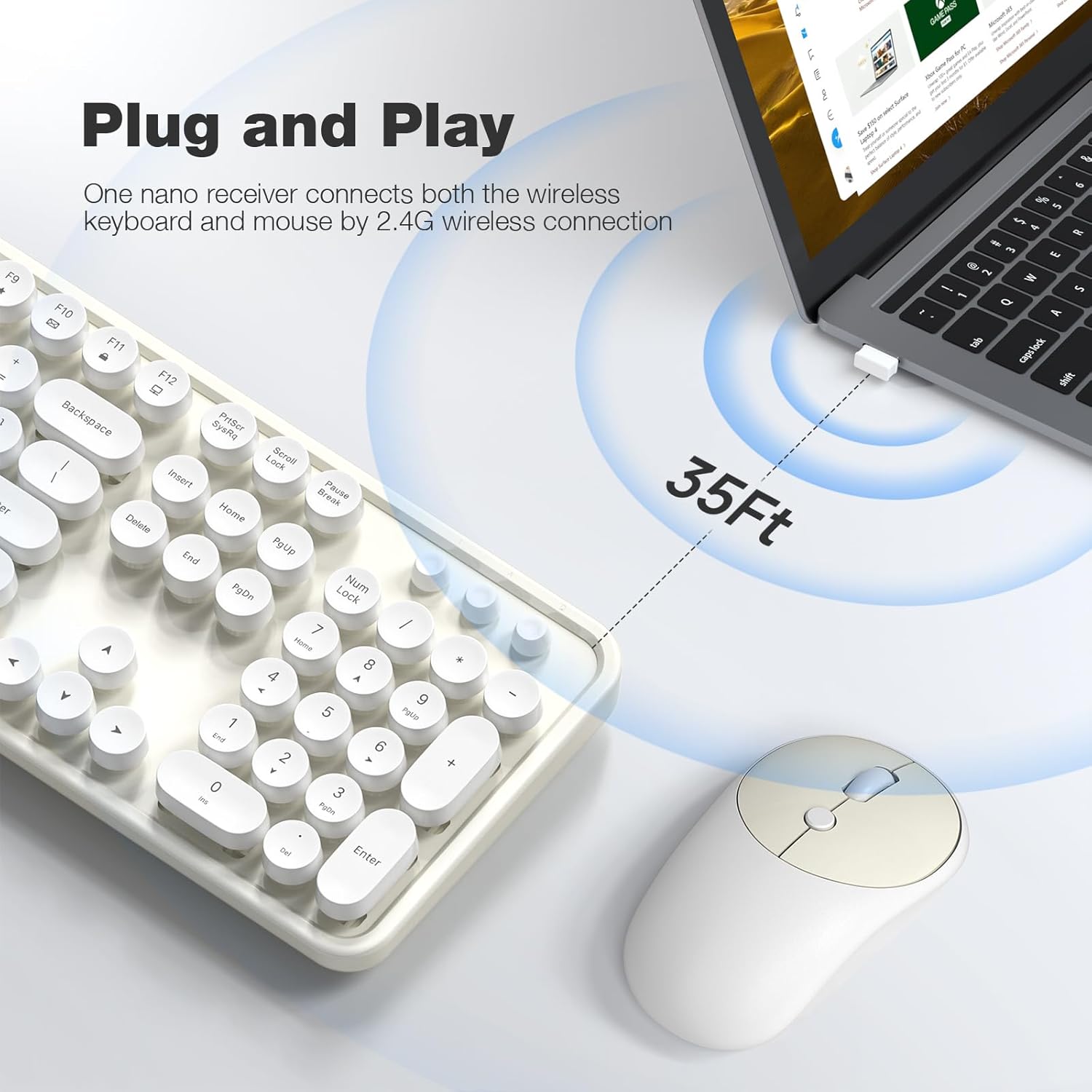 MOFII Wireless Keyboard and Mouse Combo, Computer Full Size 2.4G Plug and Play Wireless Typewriter Retro Round Keyboard and Mouse Set for Windows, Computer, Desktop, PC, Notebook - (Off White)