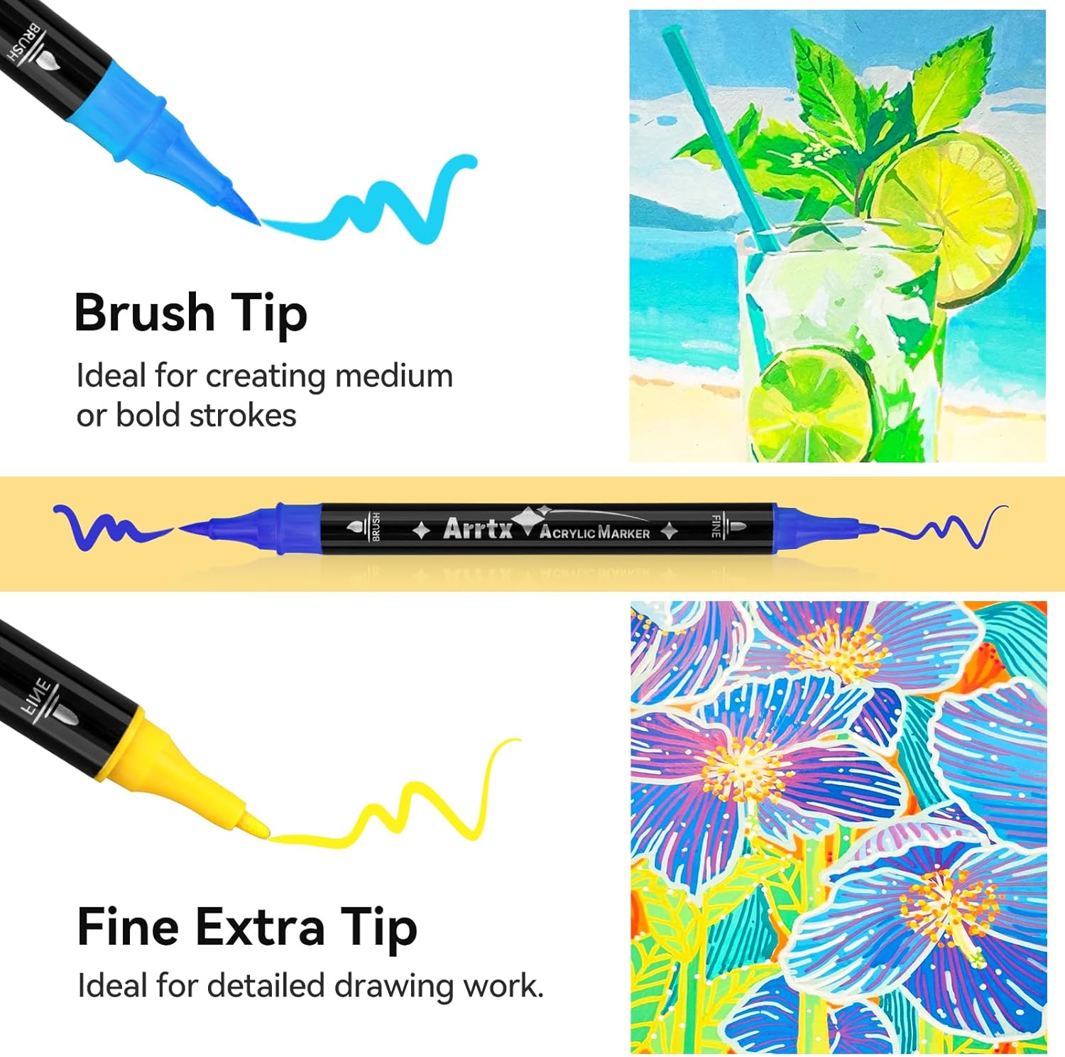 Arrtx Paint Markers Paint Pens, 32 Colors Acrylic Paint Pens for Rock Painting, Ceramic, Wood, Plastic, Calligraphy, Scrapbooking, Brush Lettering, Card Making, DIY Crafts (Fine Tip and Brush Tip)