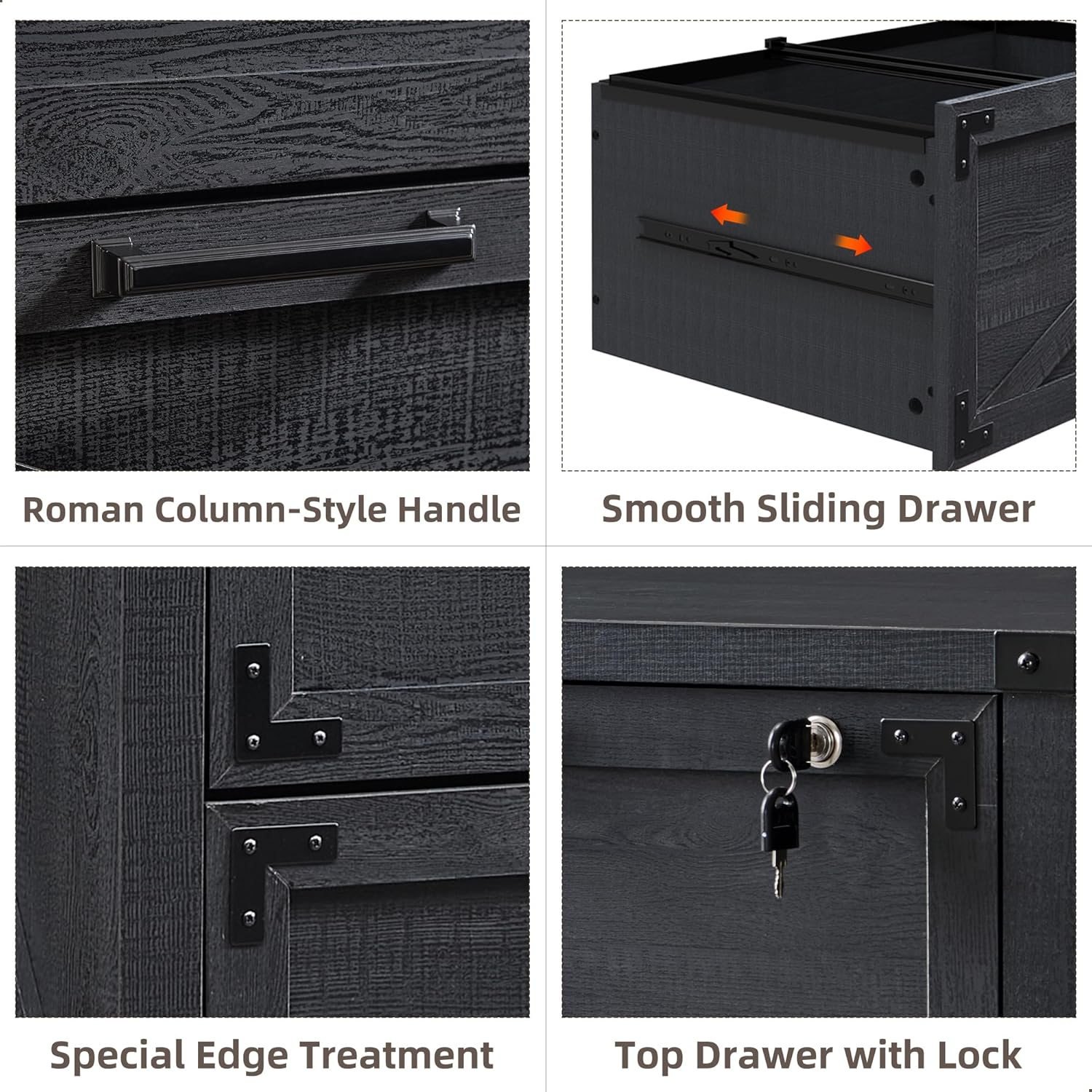 JXQTLINGMU 2 Drawer Farmhouse File Cabinet, Lateral Filing Cabinet with Lock for Home Office, Compatible Legal Letter A4 F4 Size, Black