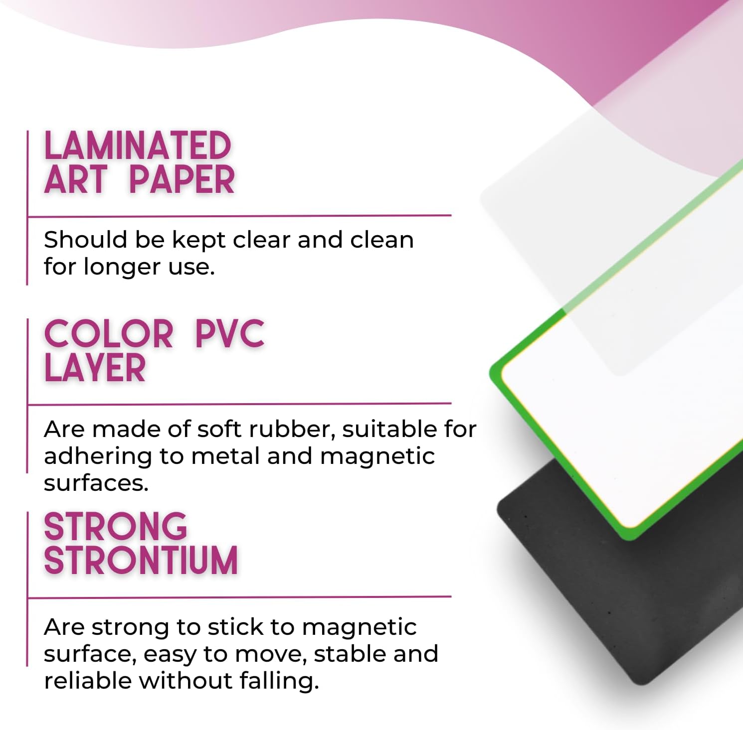 - High-quality Material: The magnetic dry-erase labels have a white writable front with a colored edge, made of laminated art paper, dry-erasable, and a 0.04 inches thickness strontium magnet, on the back for a powerful adhesion to various surfaces; Each label measures 5 x 3 inches;