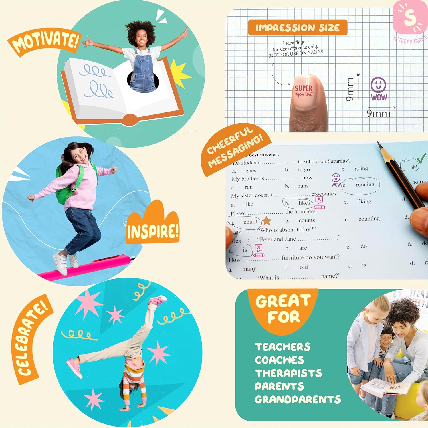 - Pre-inked Flash Stamps – Cute high quality, beautiful, vibrant, and fun stamps: WOW, Please correct, Heart, Star, and Checked