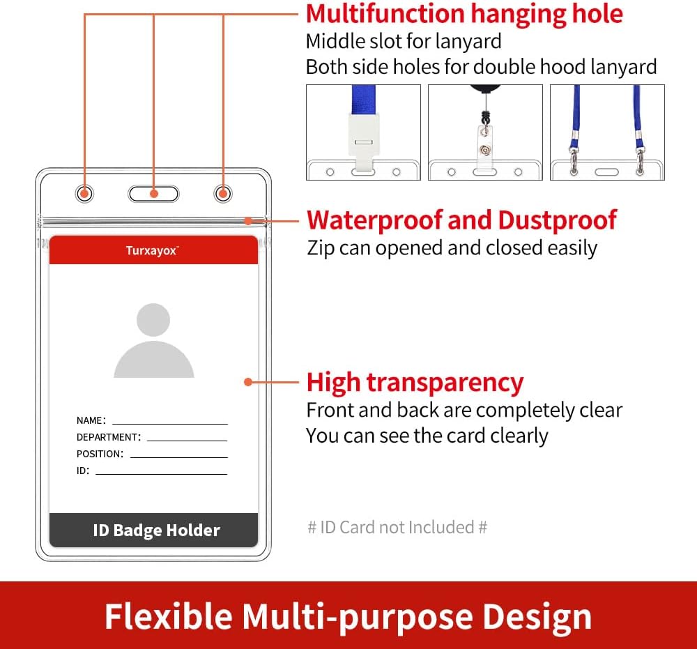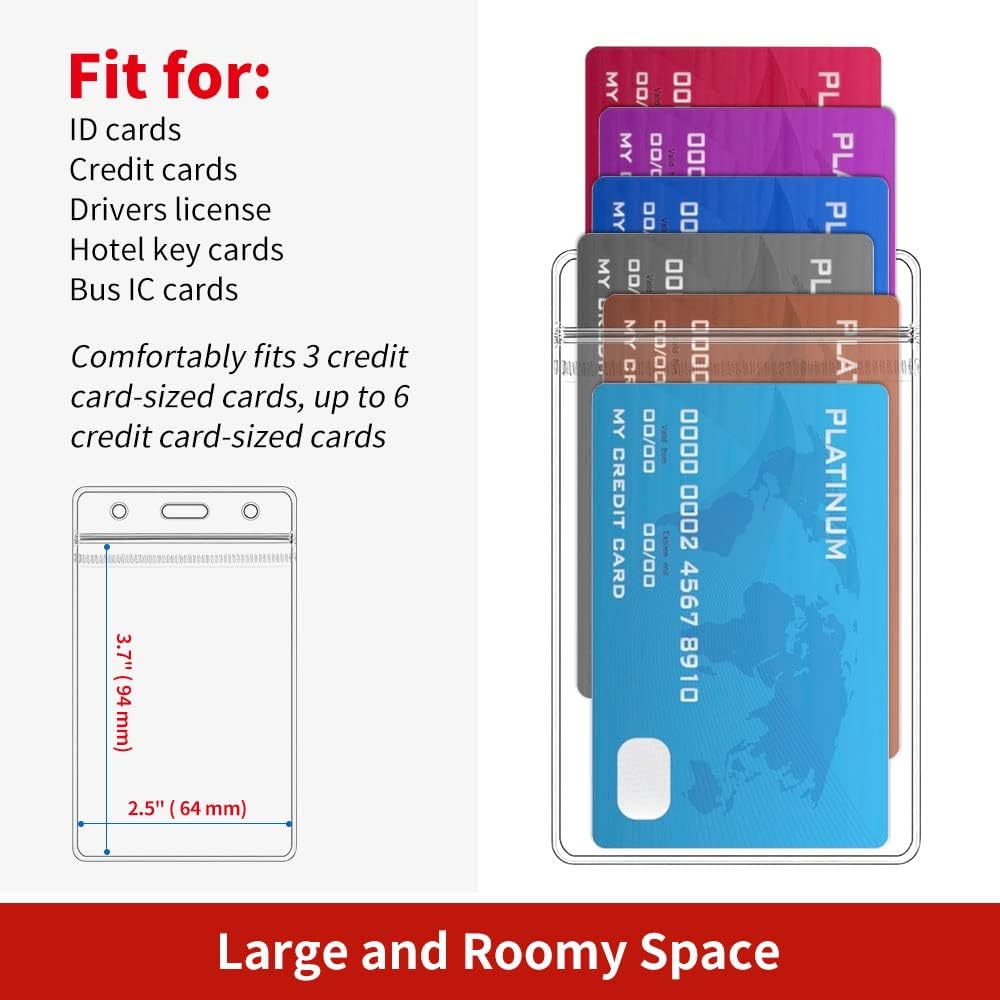 - Flexible Multi-purpose Design: Our clear ID card holder features a resealable zip, making it waterproof and dustproof, ensuring the safety and dryness of your cards and money. The dual-use hanging slot/holes design allows you to easily attach a badge lanyard, keychain, or retractable carabiner reel clip. The side holes can be used for attaching a strap, cord, string, or thread