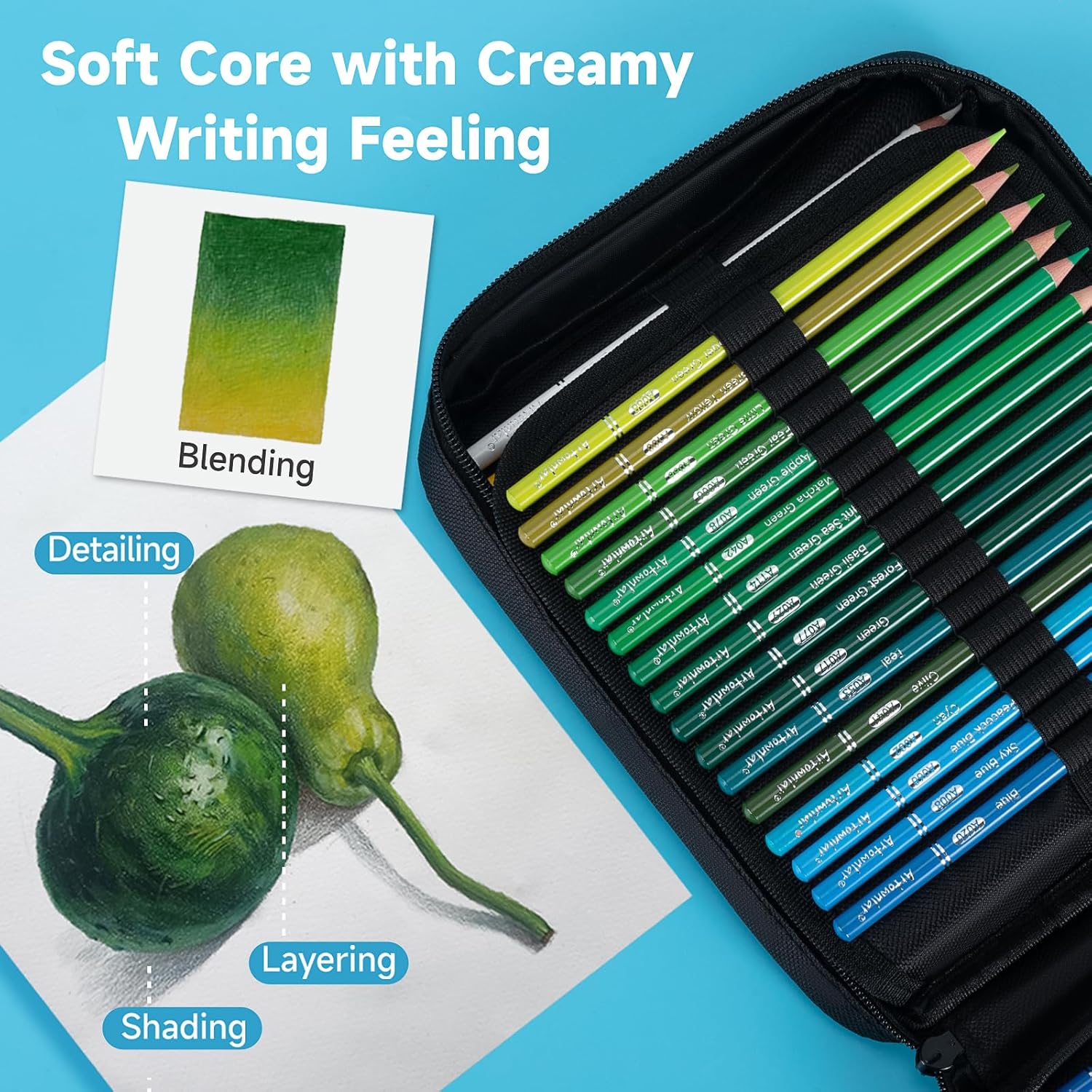 - Premium Soft Core Colored Pencils: 72 count color pencils have silky smooth velvety soft core thick leads with bright, vivid and bold assorted colors. This art pencil kit is made of high-quality basswood, which is very easy to sharpen. Each pre-sharpened pencil body has a unique number and color name for instant identification. The highly pigmented lightfast break-resistant colored pencils will bring you a nice drawing feeling.