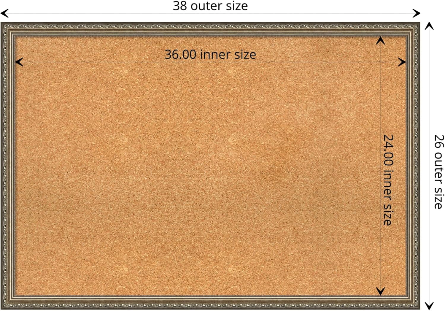 - DIMENSIONS: The overall size of this framed corkboard measures 38 in. x 26 in., including the frame. Its functional cork board area measures 36 in. x 24 in.