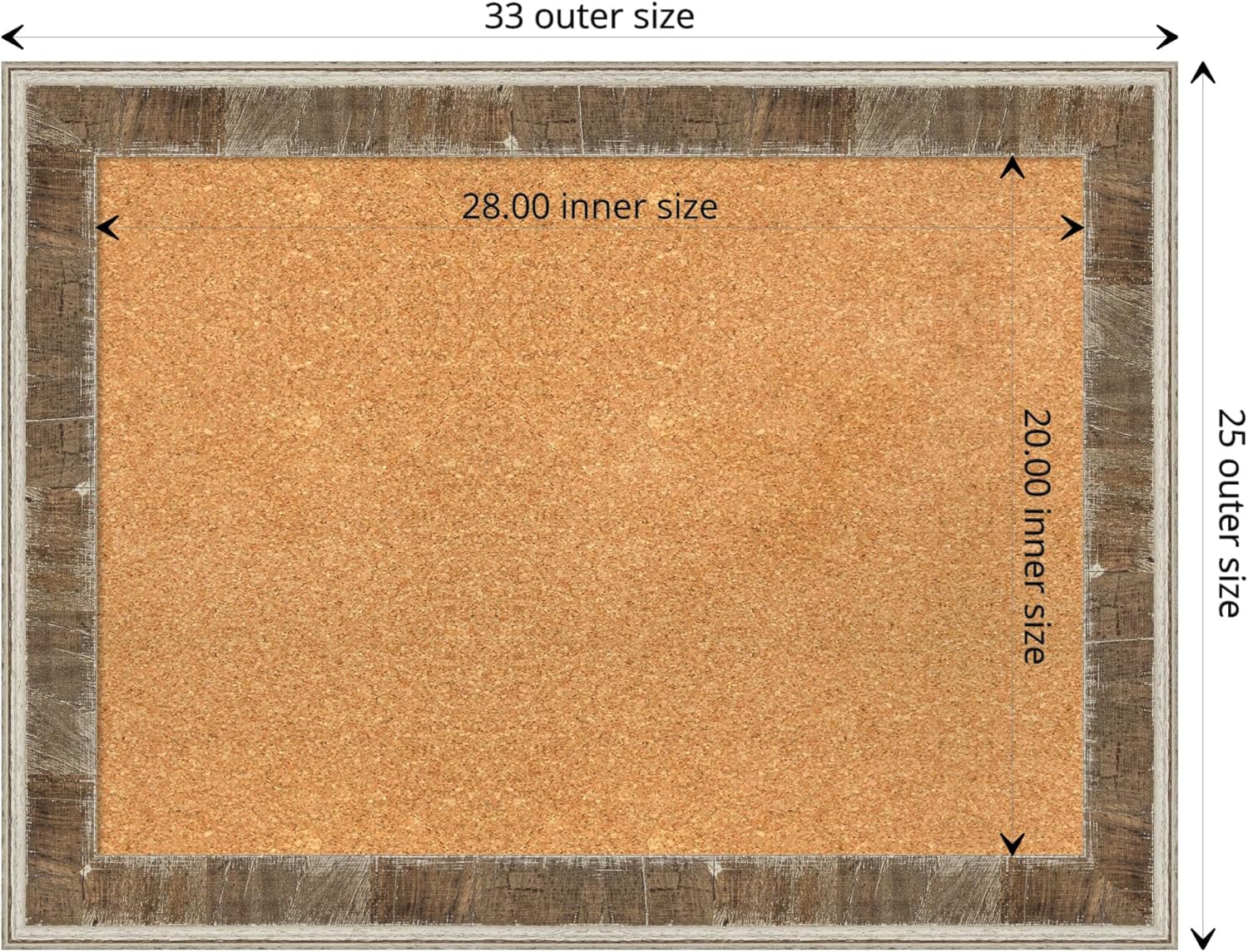 - DIMENSIONS: The overall size of this framed corkboard measures 33 in. x 25 in., including the frame. Its functional cork board area measures 28 in. x 20 in.