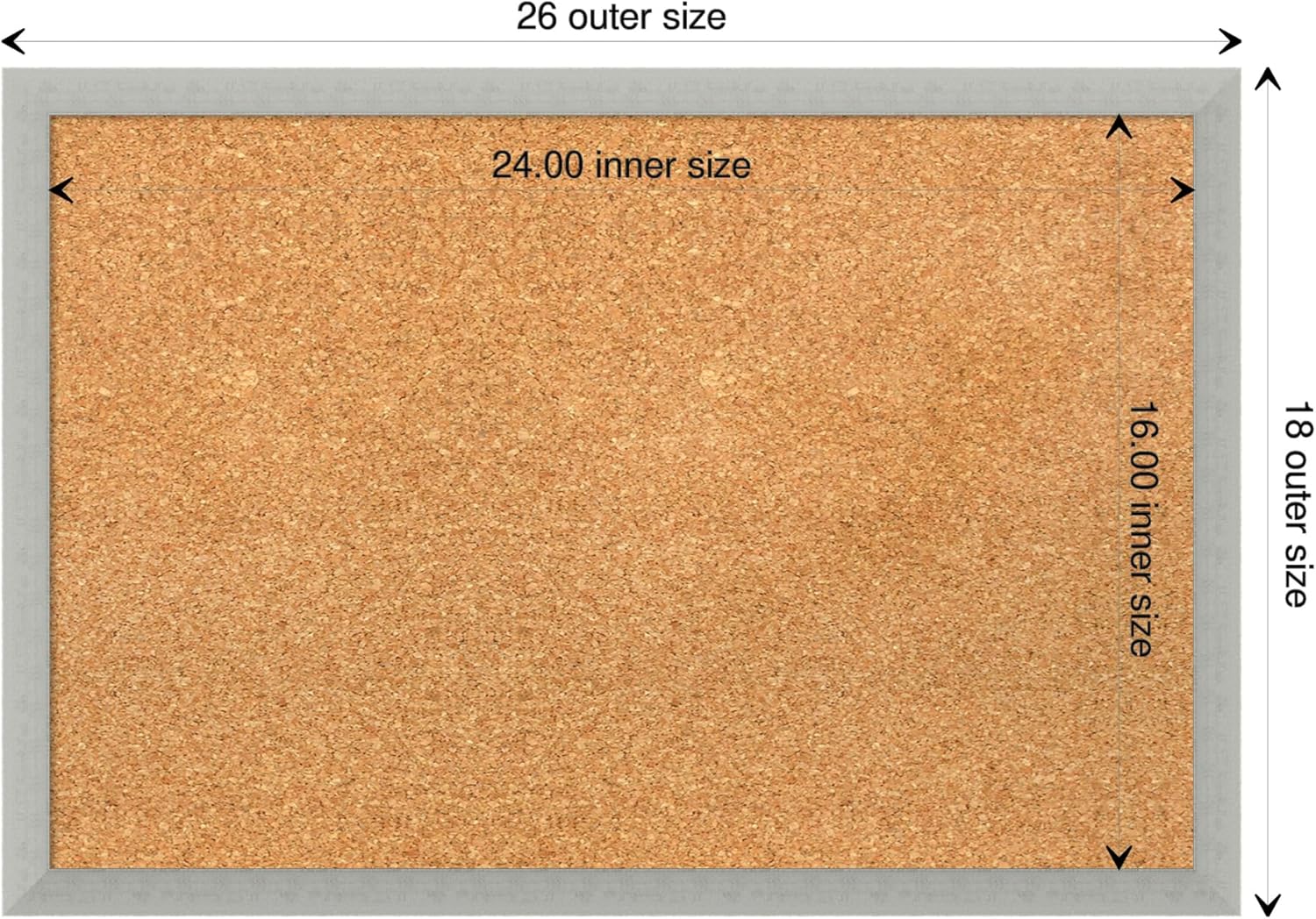 - DIMENSIONS: The overall size of this framed corkboard measures 26 in. x 18 in., including the frame. Its functional cork board area measures 24 in. x 16 in.