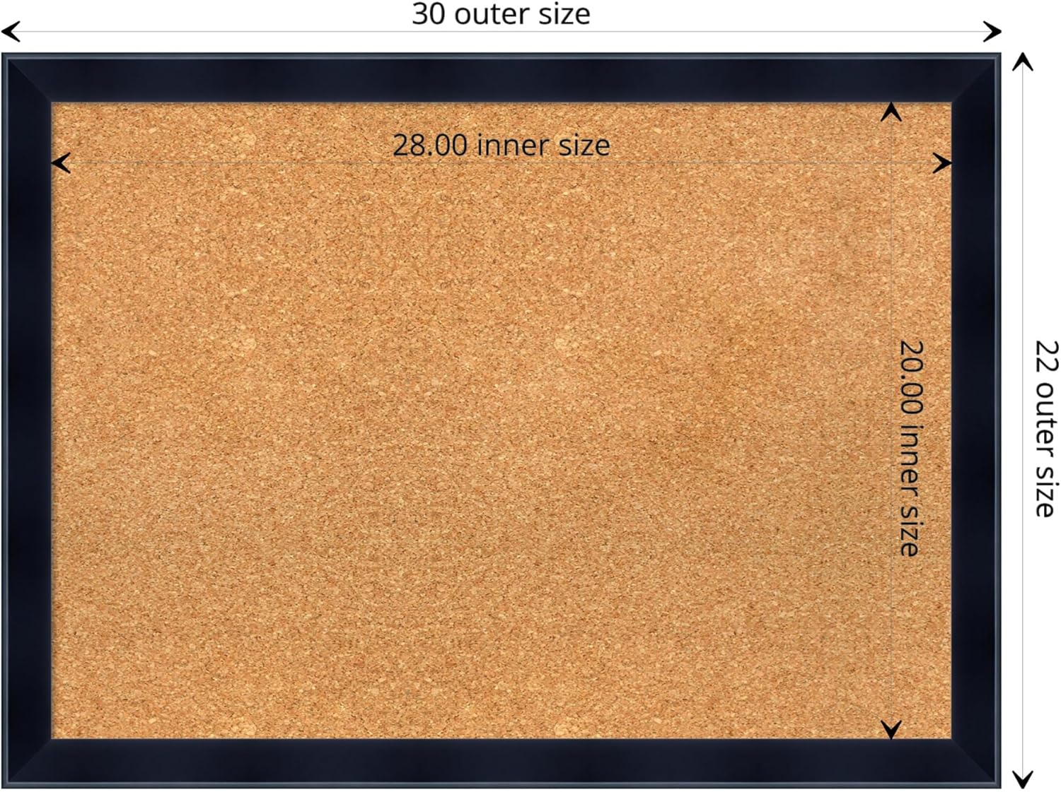 - DIMENSIONS: The overall size of this framed corkboard measures 30 in. x 22 in., including the frame. Its functional cork board area measures 28 in. x 20 in.