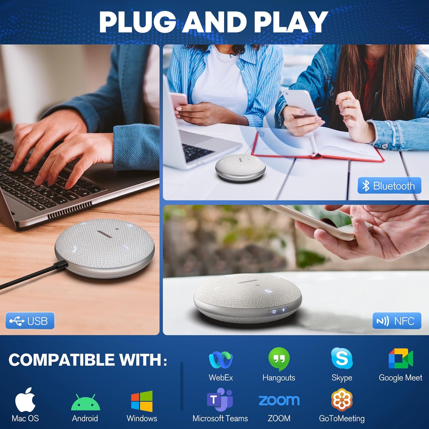 - 【Easy setup and user-friendly】The M4 conference speakerphone is plug-and-play through USB, and can easily pair with Bluetooth or NFC. No drivers are needed for this computer/laptop/mobile speaker with microphone, making it compatible with popular conferencing platforms like Zoom, Skype, Teams, WebEx and more. This portable Bluetooth speakerphone can provide up to 10 hours of battery life on one charge. It can meets the demands of a full day of meetings.