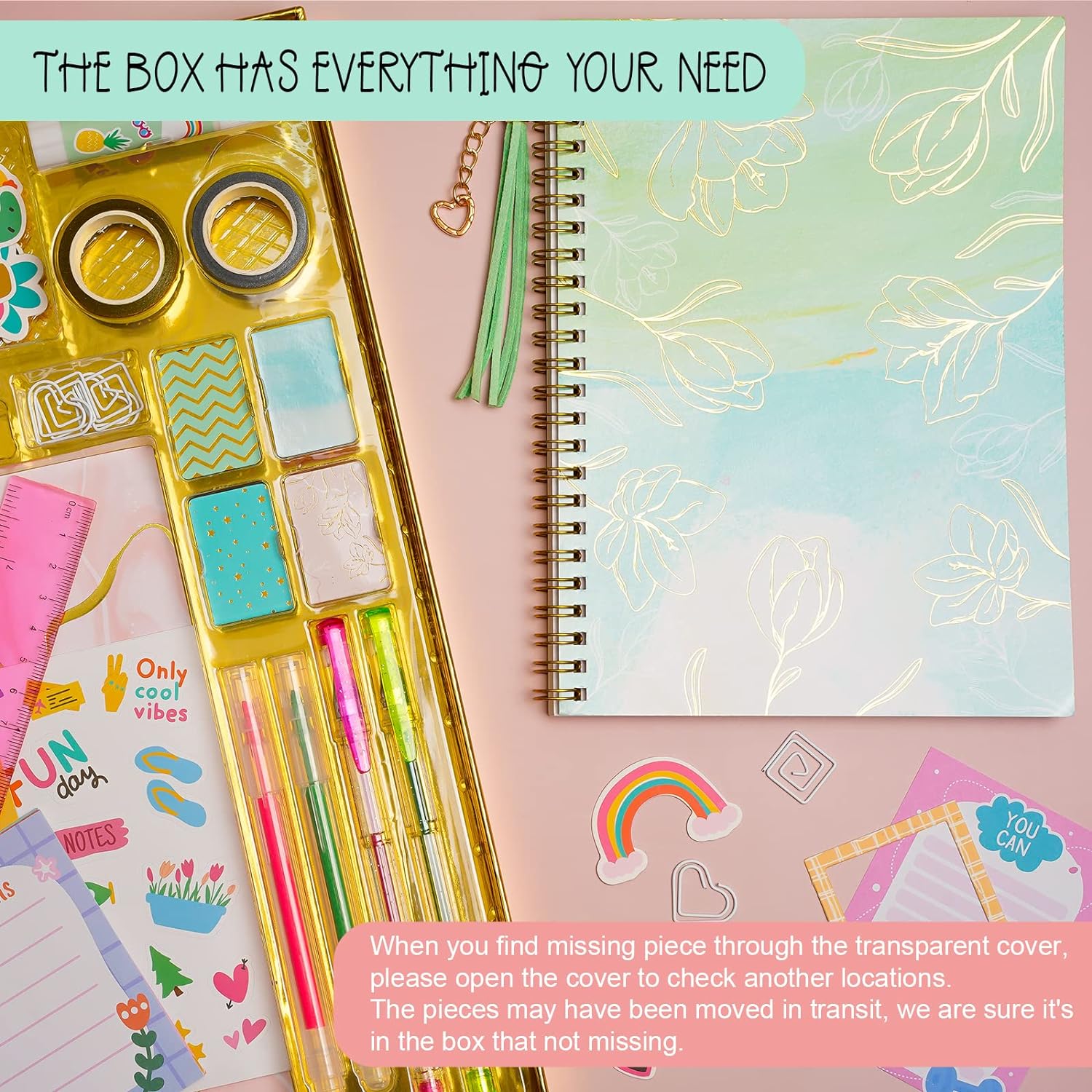 - DIY Journal Set All in One Box: Our 50+ pcs journal kit has everything needed to keep the motivation going. Included 1 beautiful 90 pages journal, 143 stickers, 8 cardboard cutouts, 10 sticky notes, 8 paper frames, 10 scrapbook pages, 4 magnetic bookmarks, 1 glue stick, 1 tassel with charm, 4 pens (2 gel pens & 2 highlighters), 2 glitter tape rolls (silver & gold), 6 paper clips, 1 ruler, they are packed in a hard gift box. Let’s use it to save memories in creativity flow and a fun way!
