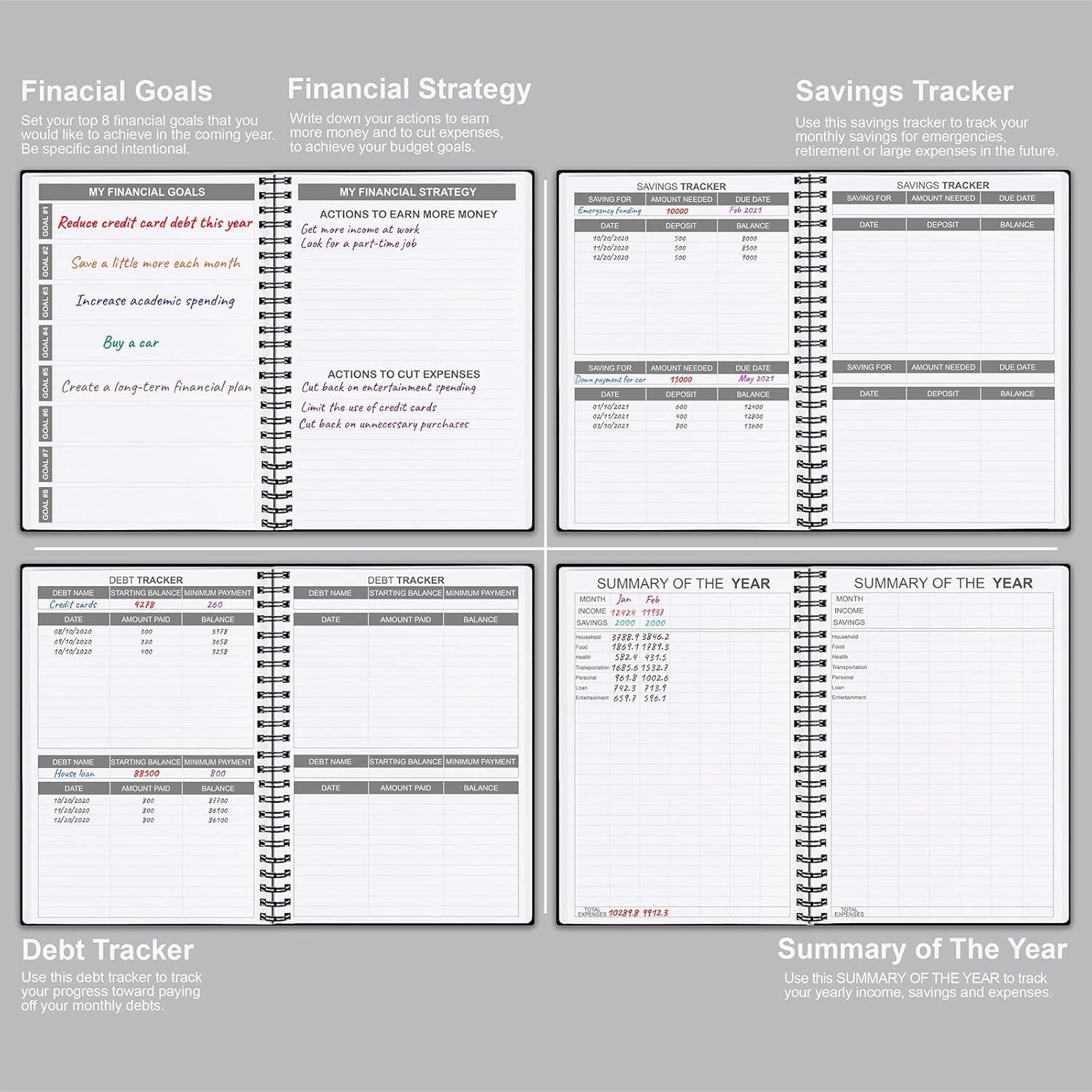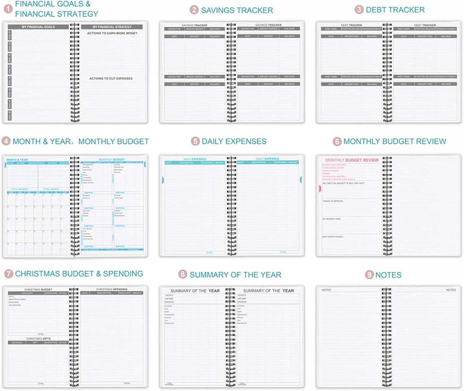- UNDATED & 1 YEAR USE - Undated finance books start with 1 page for financial goals, 1 page for financial strategy, 4 pages for saving tracker, 4 pages for debt tracker, followed by 12 months(10 pages per month, 1 unique color for each month). 2 pages for Christmas budgeting, 2 pages for yearly summary and 12 pages for notes(colleague ruled). It is undated, so you could start at any time, suitable for 1 year use
