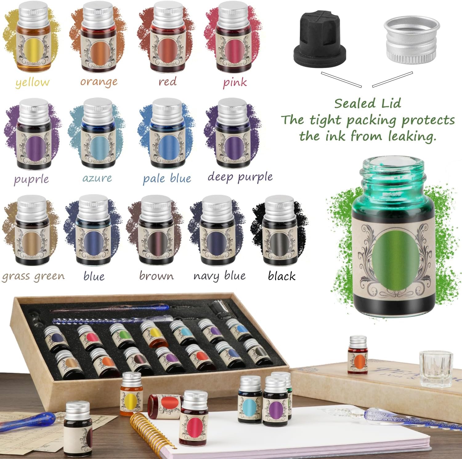 Calligraphy Pens, Dip Pen Set with 14 Color Inks, Glass Writing Instrument for Beginners
