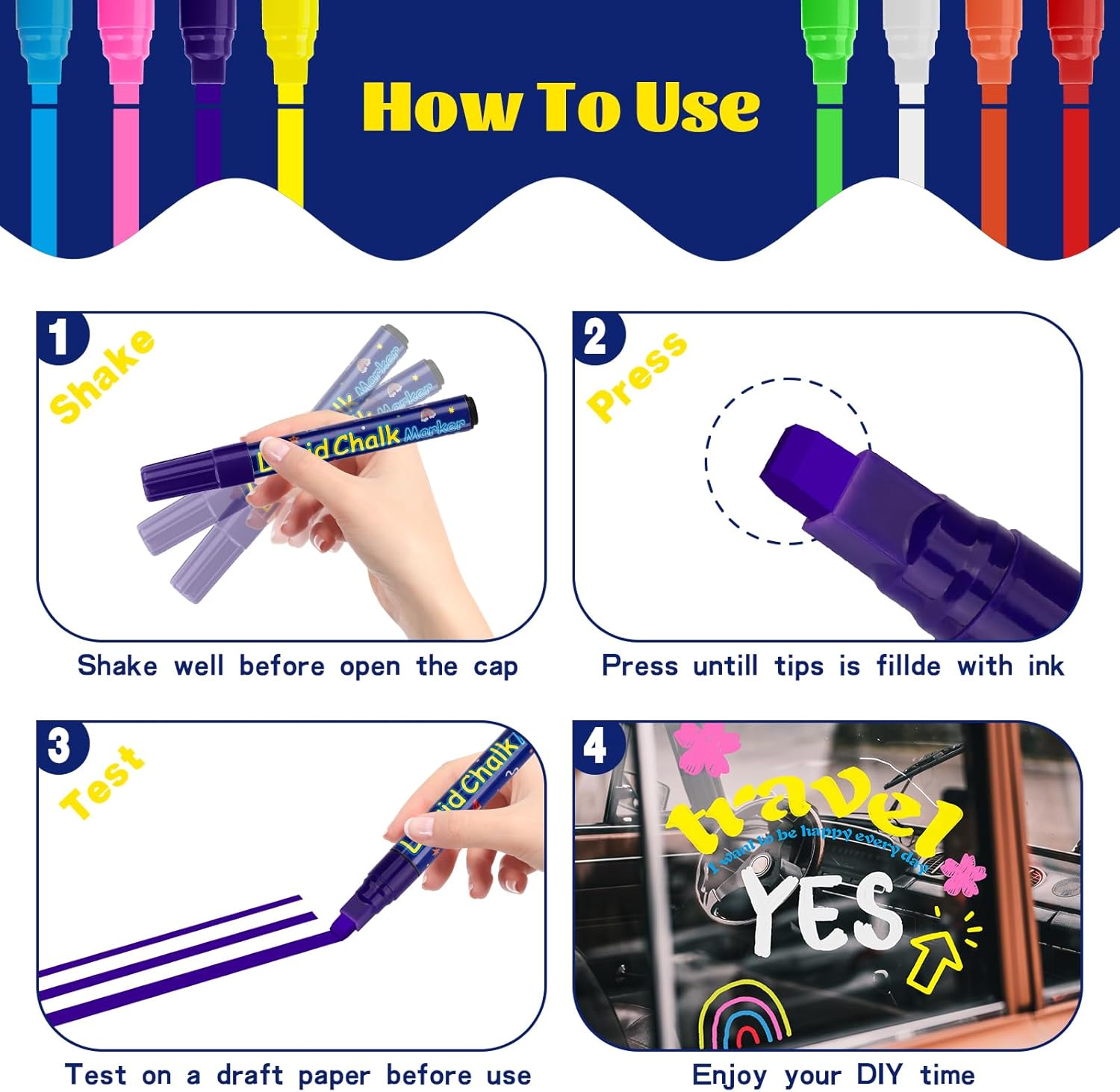 - 【Versatility Across Surfaces】Whether used as auto window markers or for glass washable projects, these jumbo chalk markers prove their versatility on any non-porous surface. Ideal for car decoration, whiteboards, chalkboards, bistro boards, Christmas banners, posters, and various DIY arts and crafts.