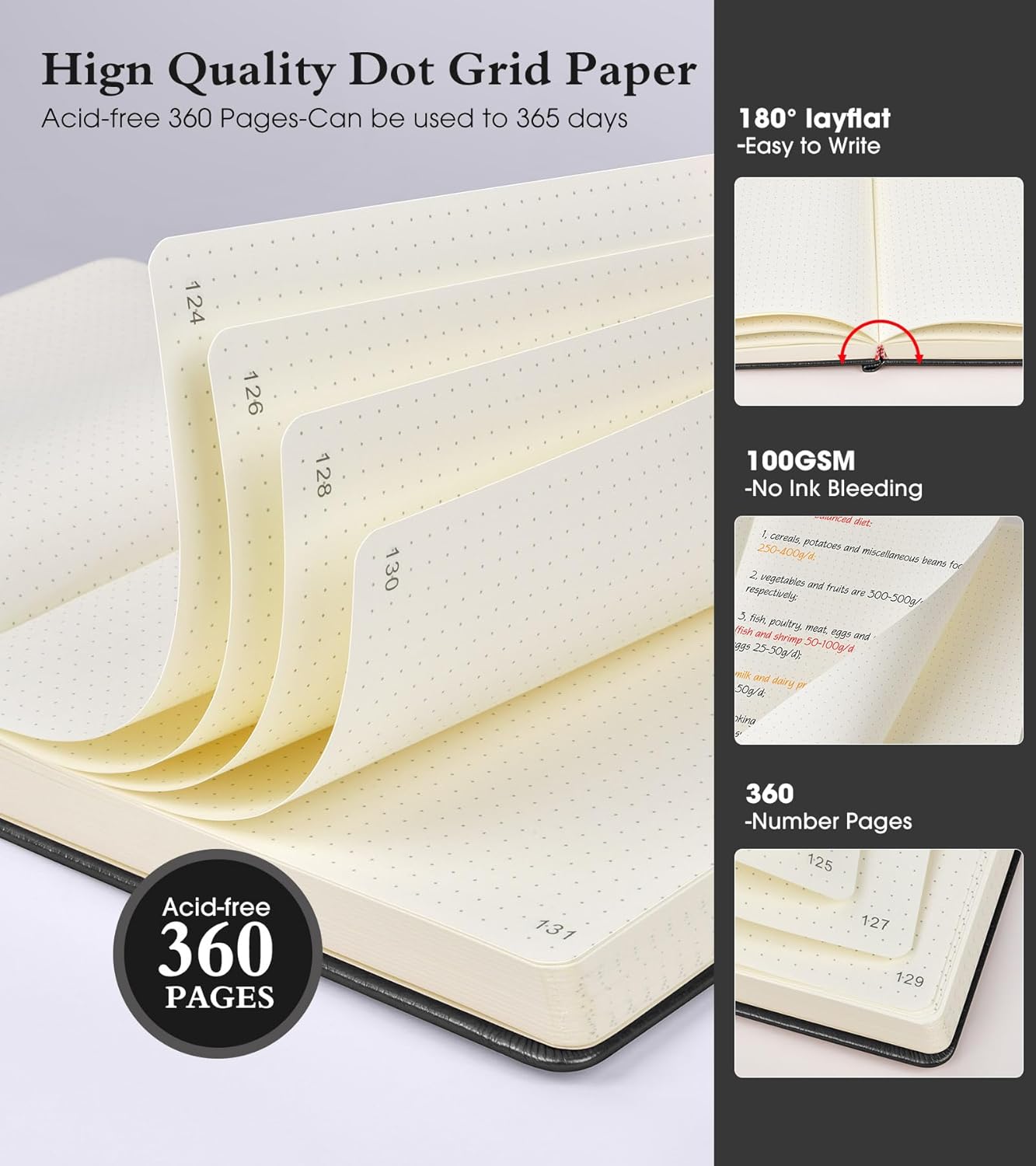 - 【180°Lay Flat Dot Notebook】 The 180° lay flat design makes writing easier, reading more convenient, and taking notes more efficient.At the same time, the bullet dot journal is designed with1 elastic closure band & 1 elastic bookmark band. to make it tightly closed to protect your content, and the inner paper will not be curled and kept flat.
