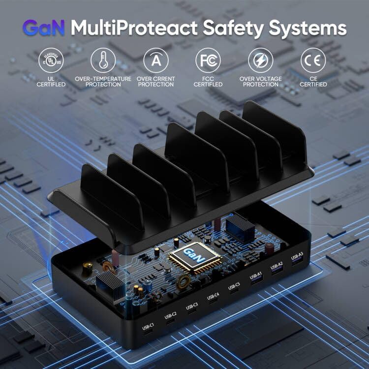 - 8 Port Charging Station for Multiple Devices: Our multi charging station comes with 5 USB-C ports to accommodate modern devices compared to those charging stations which only have USB-A ports. This charging dock shares a total output up to 300W with dual 65w ports to charge laptops. Its extra 30w and 20w ports can power tablets and smartphones.