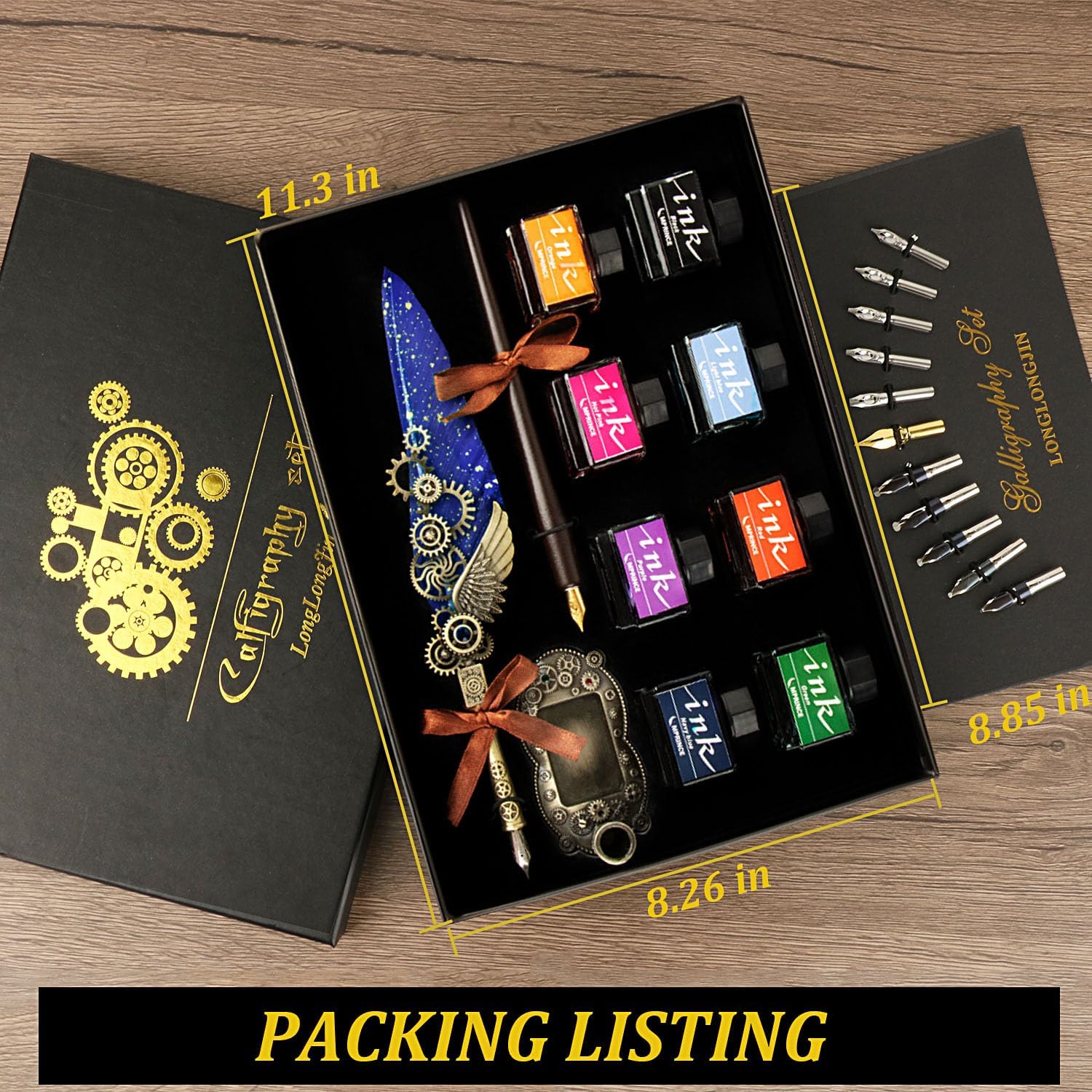 - Calligraphy Set: An calligraphy set exquisite set with stainless steel nibsperfect to meet the different need in your creation of calligraphy,Its exquisite vintage design adds a touch of elegance to your writing experience and feather quill pen.
