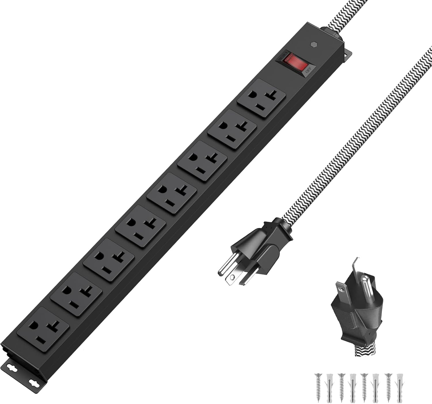 - ✔METAL WALL MOUNT POWER STRIP: This mountable power strip boasts a high-quality metal casing, ensuring durability and making it perfect for use in the garage, workshop, office, or on a workbench. With 4 metal mounting holes, it facilitates quick installation on desktops, under tables, workbenches, or walls, accommodating both vertical and horizontal setups.