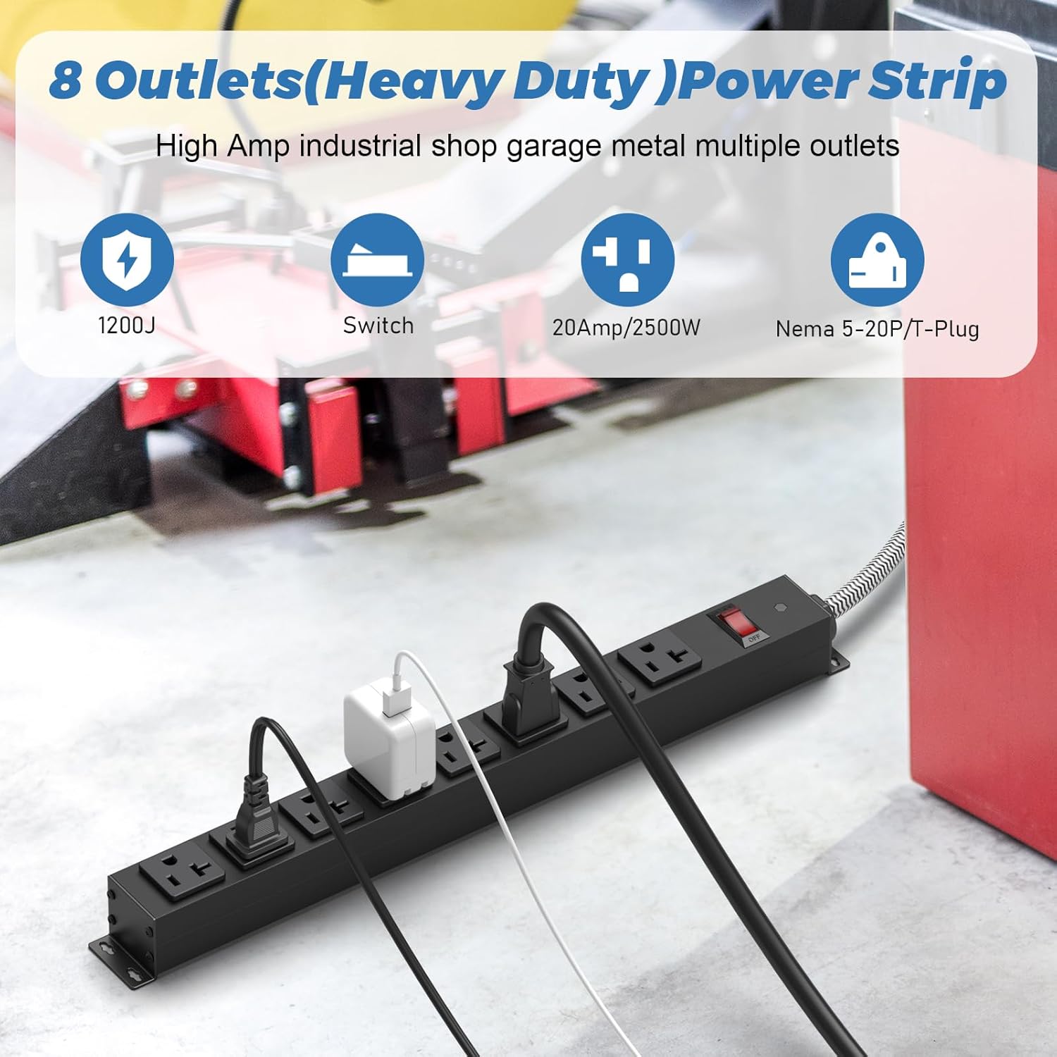 20 Amp Power Strip Heavy Duty, 12 Gauge Extension Cord for Appliance Workbench Garage Industrial, Metal 8 Outlets Combine with T-Plug Adapter 5-20R T-Slot, 1200J Surge Protector