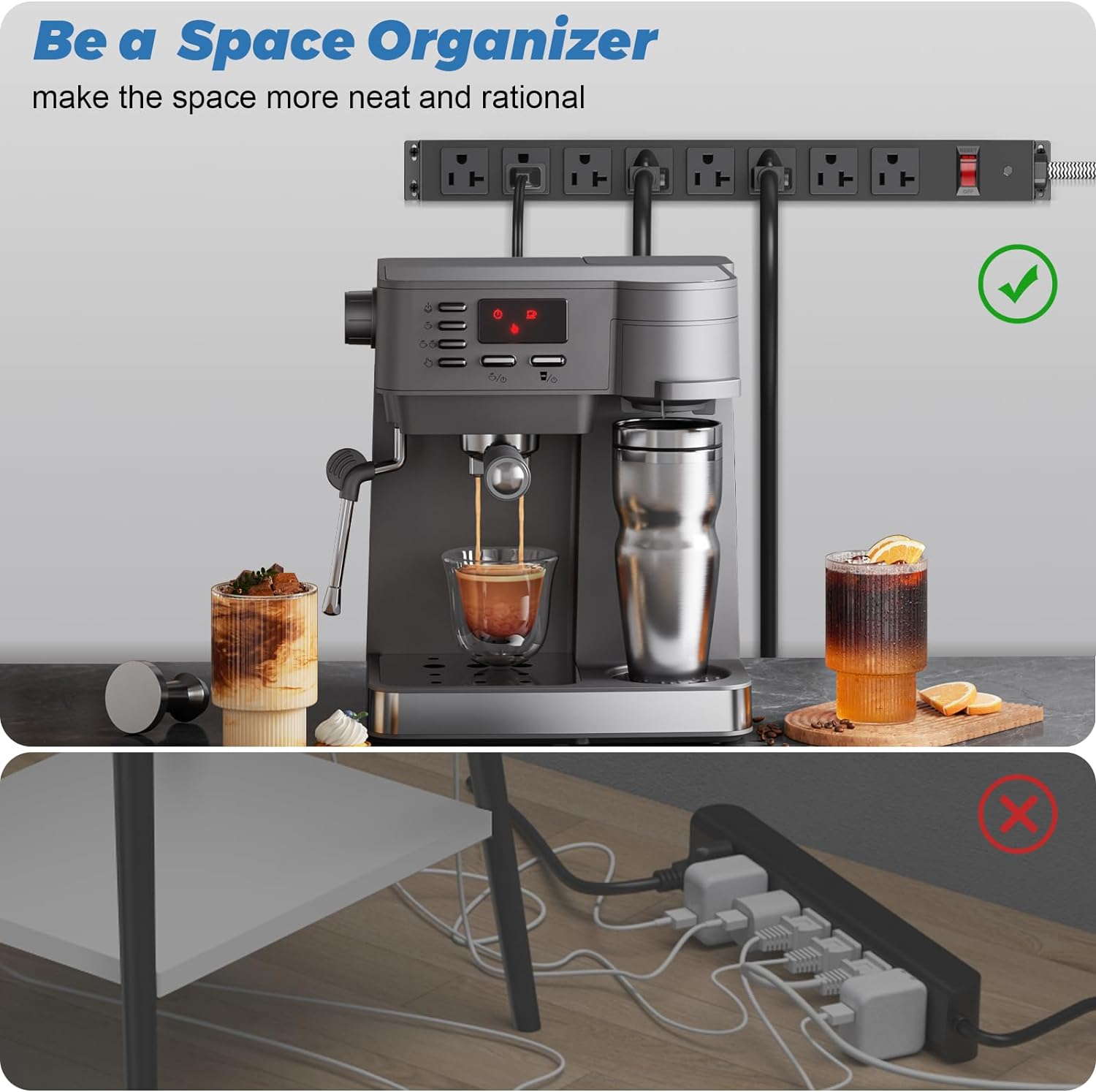 - ✔POWER STRIPS WITH SURGE PROTECTION: Features 1200J surge protector and a 20A circuit breaker, providing a reliable power supply for devices while preventing short circuits, overcurrent, overheating, and overvoltage. If the current exceeds 20A, the circuit breaker automatically cuts off power to prevent damage. After powering off, simply reset by turning off the power and pressing the reset switch.