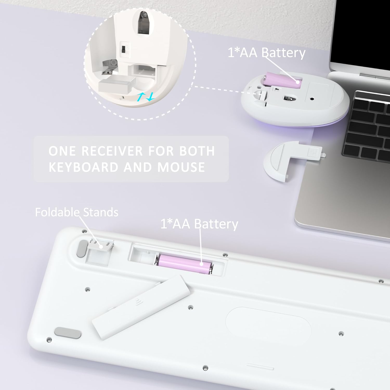 - ONLY 1 USB RECEIVER: The keyboard doesn’t have a USB receiver, wireless keyboard and mouse share 1 USB receiver, placed near the mouse battery slot