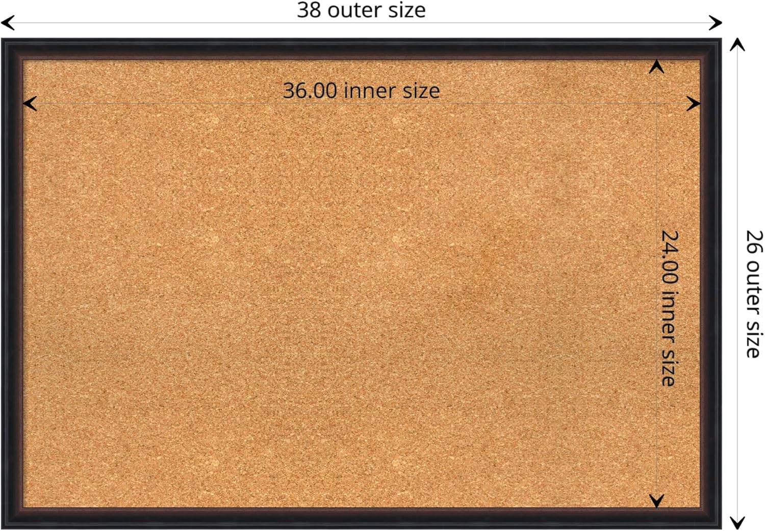 - DIMENSIONS: The overall size of this framed corkboard measures 38 in. x 26 in., including the frame. Its functional cork board area measures 36 in. x 24 in.