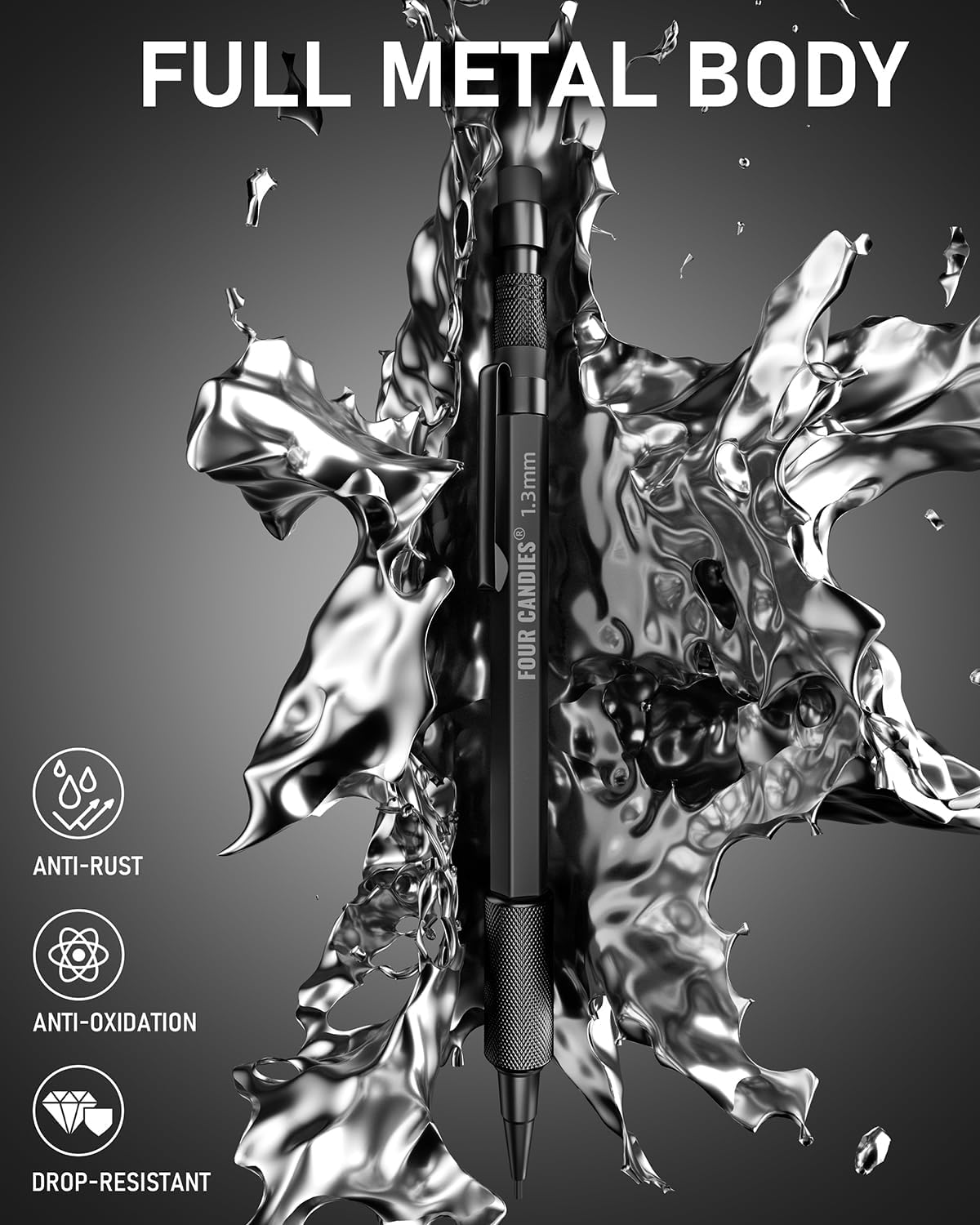 Four Candies 1.3mm Mechanical Pencil Set with 72 Lead Refill, 3PCS Metal Weatherproof Body Heavy Duty Carpenter Pencil, 3 Eraser, 16 Eraser Refill, for Outdoor Woodworking Drafting Marking with Case