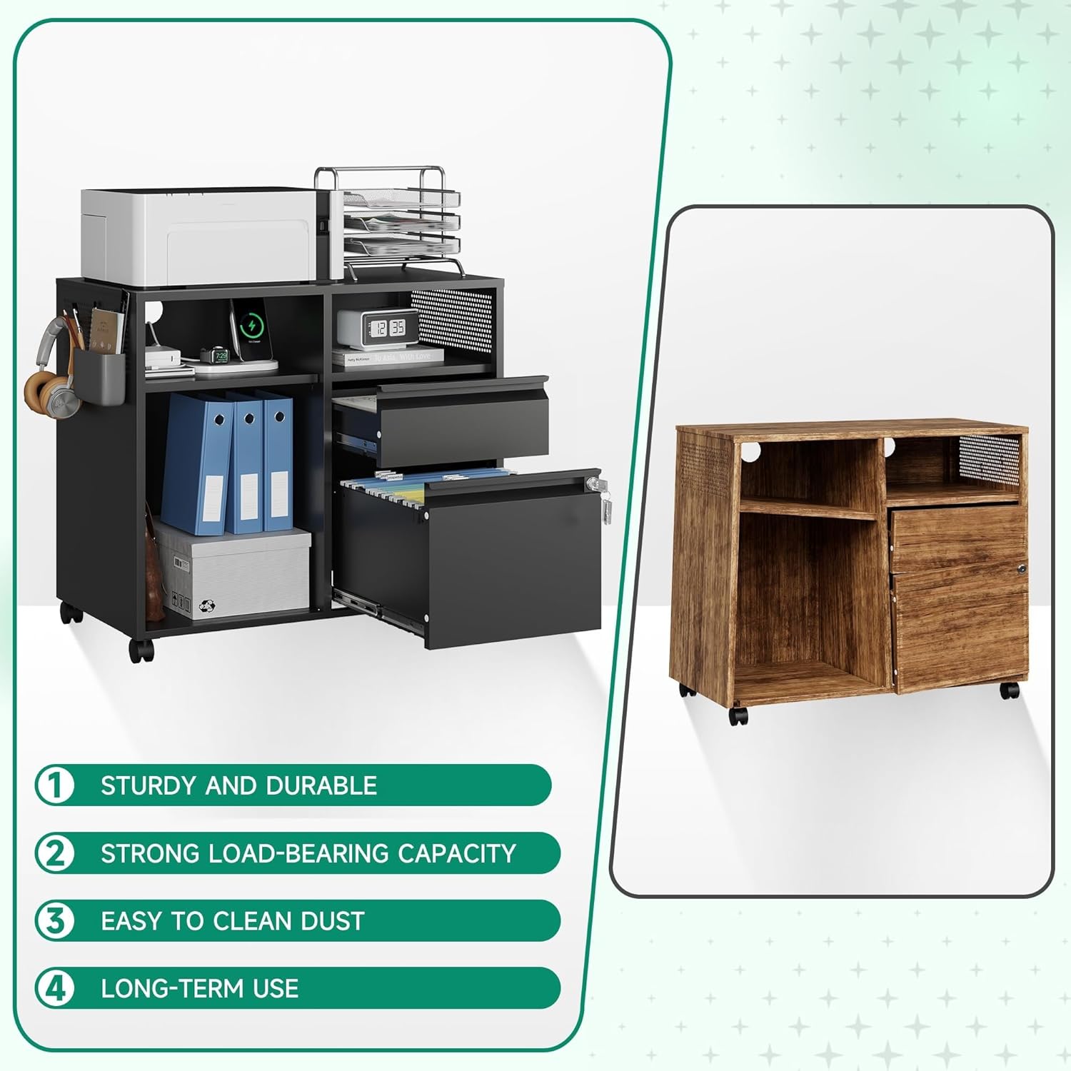 - ăEasy to moveă4 removable wheels- printer stand can be moved and adjusted in position freely,2 wheels lockable to keep cabinet stableďźDrawer with lock ensure the safety of items.