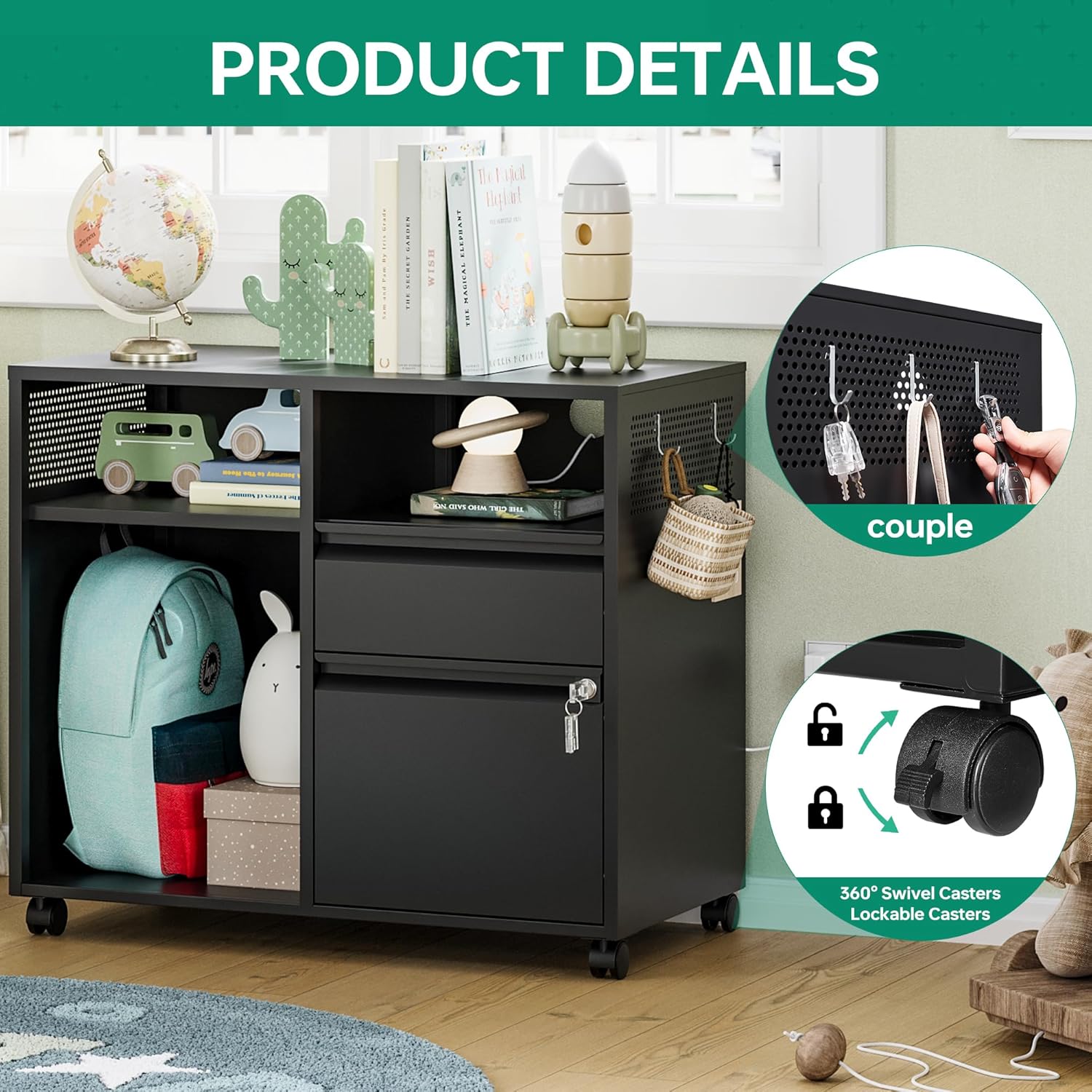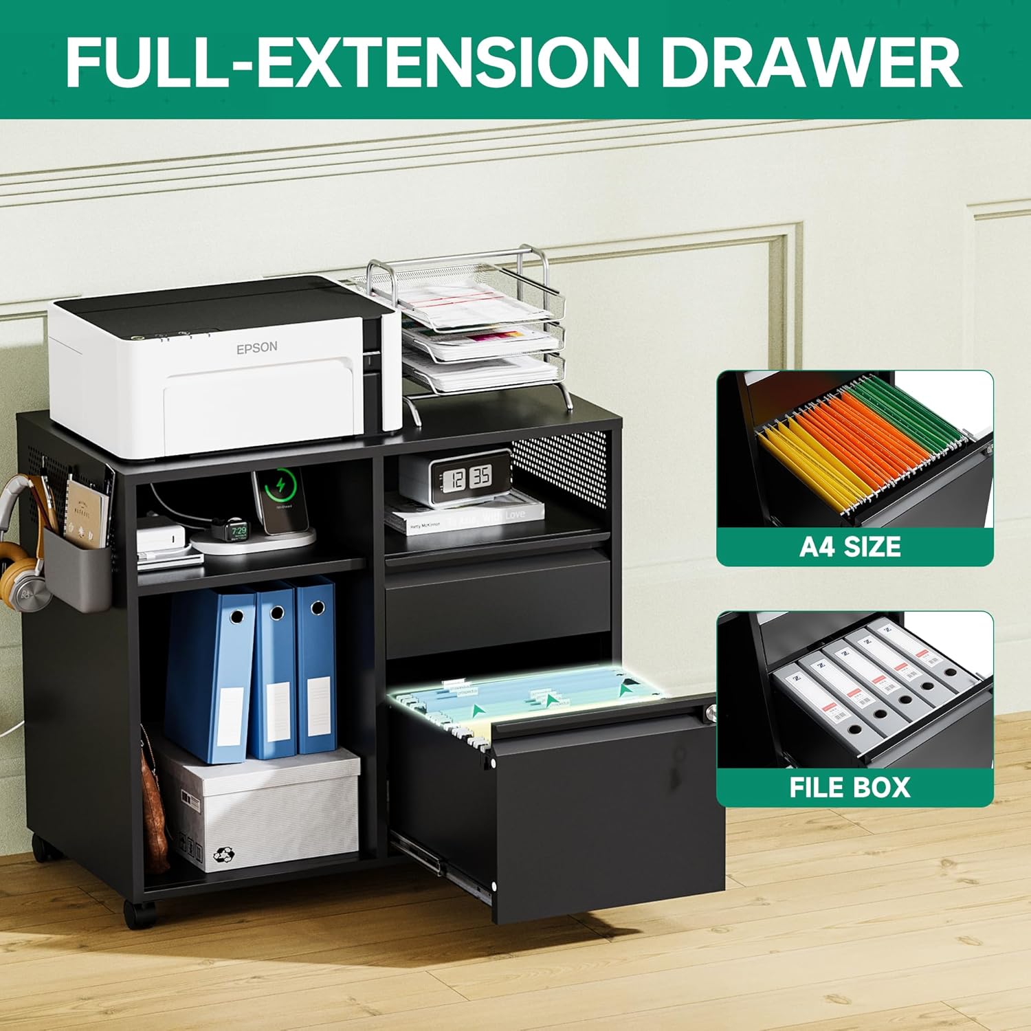 - ăMultifunctional Filing CabinetăLateral filing cabinet with open storage spaces, organization and storage drawers,holds printer stand and office craft storage,side hole panel design is beautiful and can hang items,modern delicate appearance ornamental to your office & home.