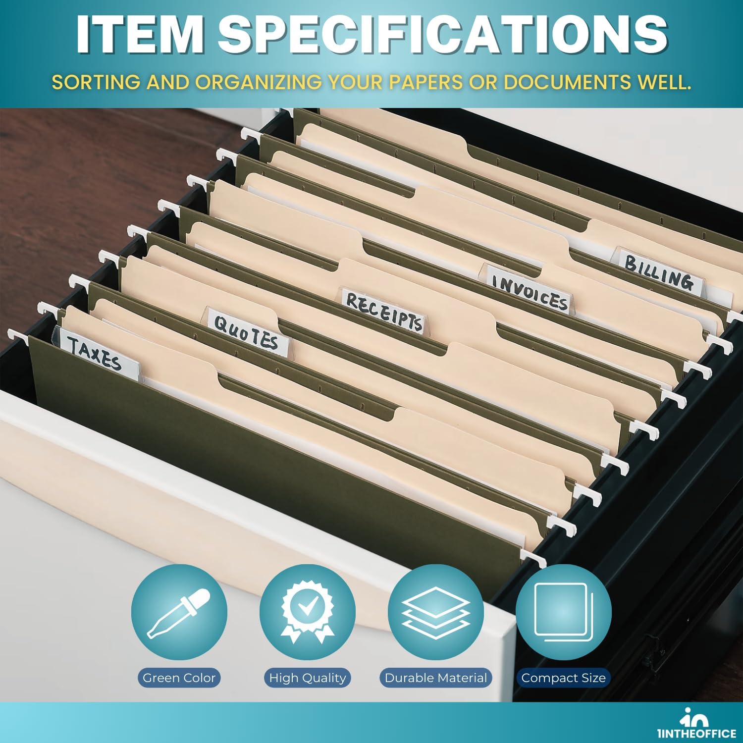 1InTheOffice Green Hanging File Folders Letter Size, Hanging Organizer File Folders, Green Hanging Folders, 1/3 Tabs, 11 pt, 50 Pack