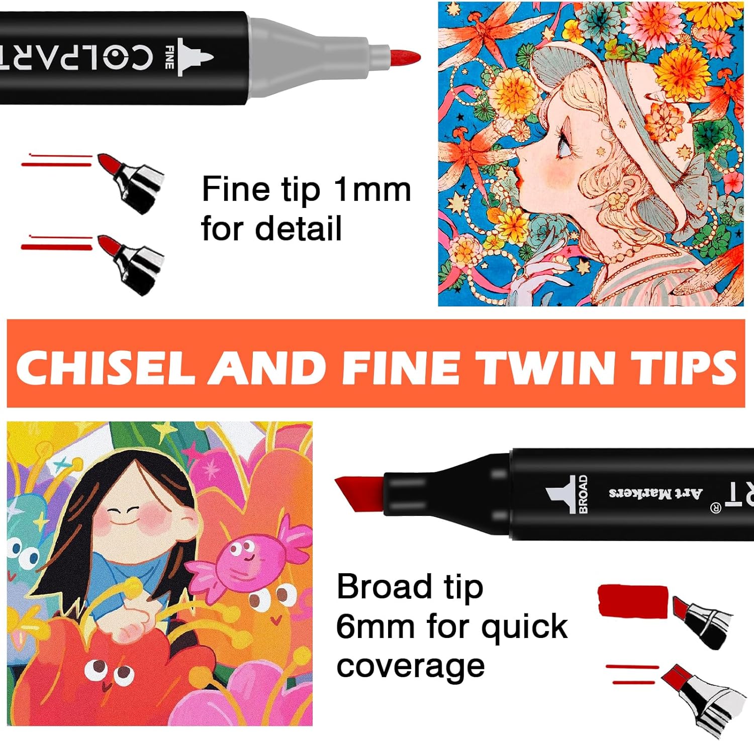 - 【Dual Tips Alcohol Markers】Dual Tips Art Markers Design allows you to make thick and thin lines without changing markers.Includes Fine tip 1mm and Broad tip 6mm twin tips for precise highlighting, sketching and underlining. Thin markers can be used to write and hook line while thick art markers professional are suitable for drawing and coloring.