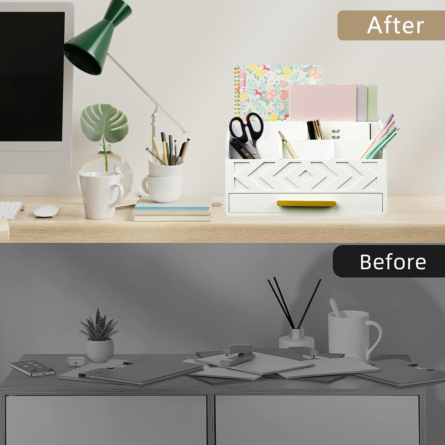 - STYLISH WOOD DESKTOP ORGANIZER: Keep your mail holder countertop clean and tidy with this wood desk organizer with drawers. Available in stylish white/gold color scheme, our desk mail organizer combines functionality with elegance, perfect for desk organization in any workspace.
