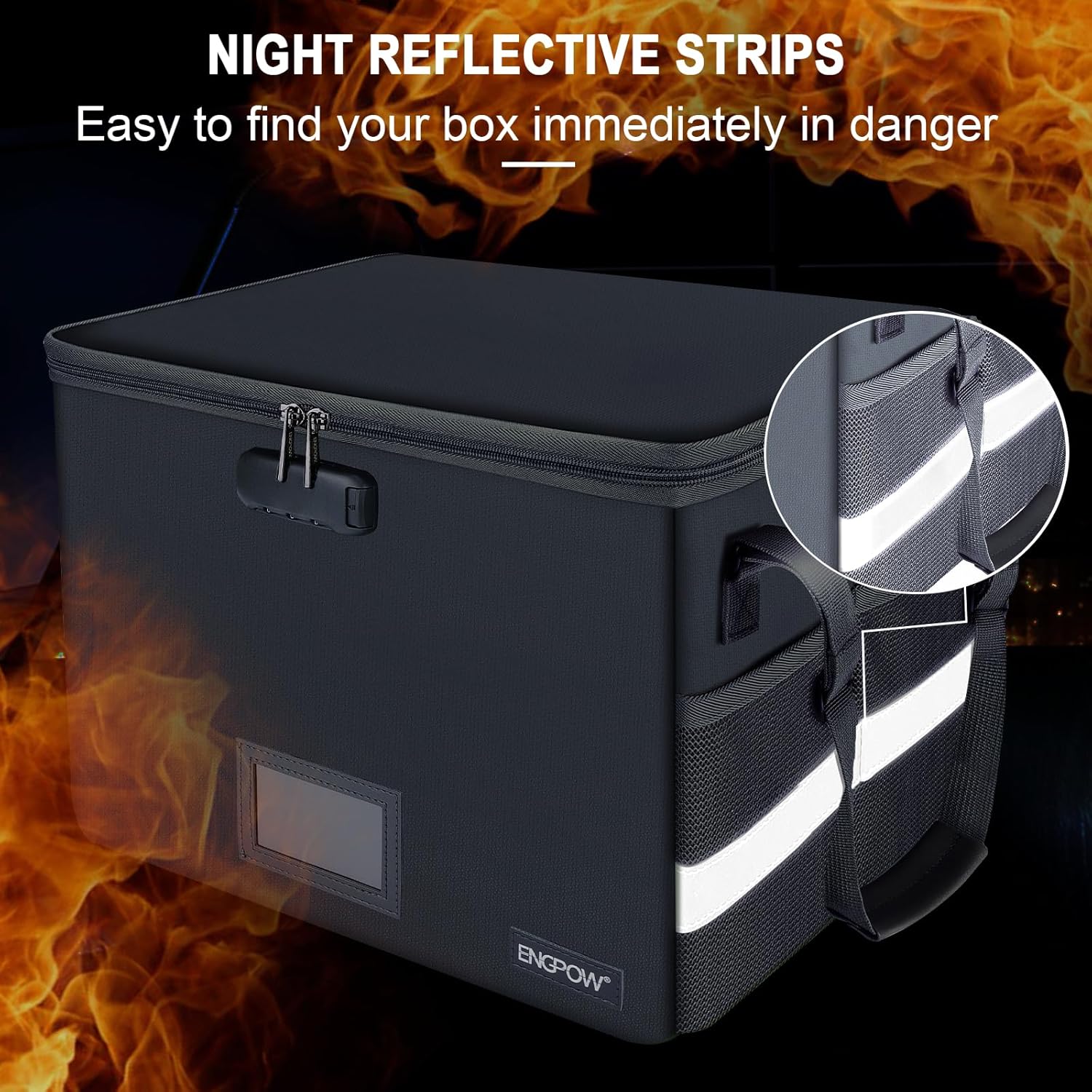 - Fireproof and water-resistant: Fireproof lock box is made of double layered non-itchy silicone coated fiberglass which stands up the temperature up to 2000℉.It has been passed by SGS TEST(UL94 VTM-0 Certified).Fireproof file box is not only fireproof but also high water resistant in case it gets wet for any reason.Nothing is completely foolproof, but added protection is always a good idea.