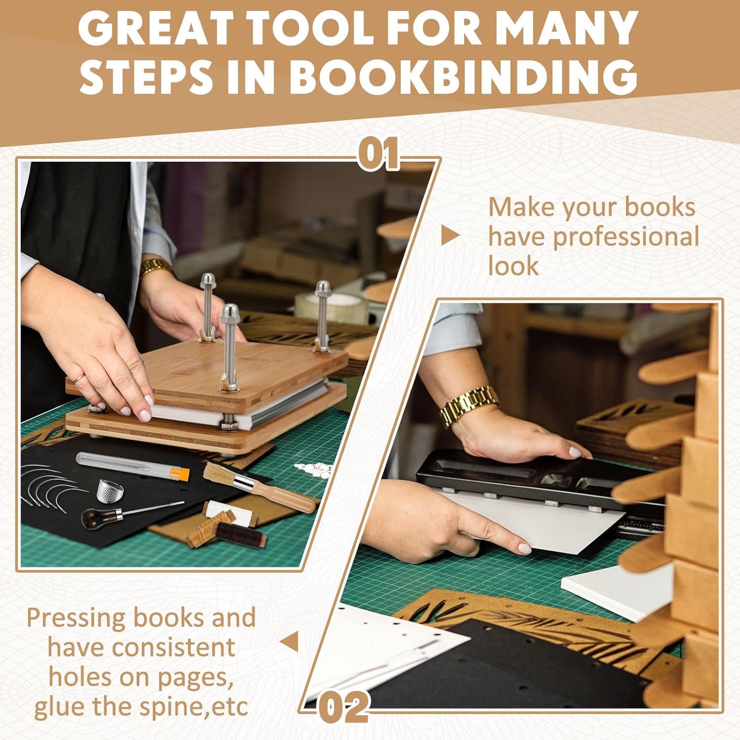 - Versatile and Applicable Tool: the book binding materials feature a multipurpose wood press, capable of accommodating various stages of the binding process; Whether to press the book, create holes in the page, or glue the spine of the book, this tool has bases covered allowing neat, professional finishes; The kit stresses ease of use, making it an ideal tool for beginners eager to learn bookbinding