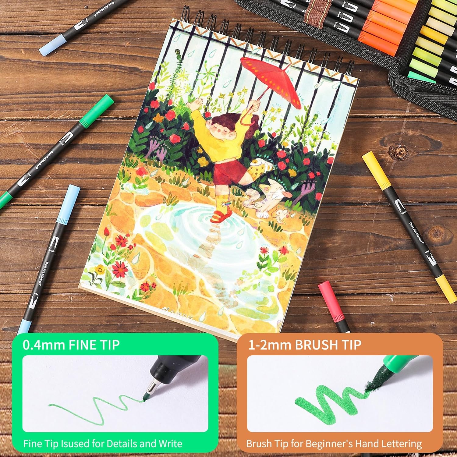 - Double-tip MARKER DESIGNļ¼Double-tip Brush Pen allows you easily switch between creating crisp details and laying down thick, thin, or varied lines in one stroke. 0.4mm fine tip is great for sketching, outlining, and details, works well for intricate coloring books, writing, and doodling; 1-2mm soft brush tip for shading, coloring, quickly coloring in large areas art projects, hand lettering, and calligraphy beginners.