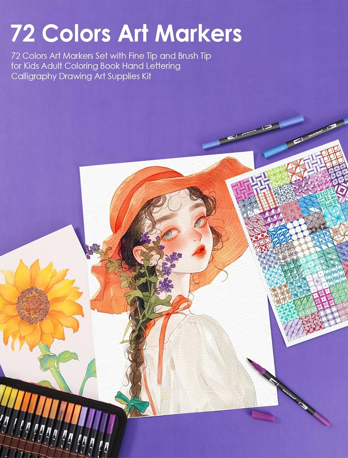 Double Brush Marker Pens, 72 Colors Art Markers Set with Fine Tip and Brush Tip for Kids Adult Coloring Book Hand Lettering Calligraphy Drawing Art Supplies Kit