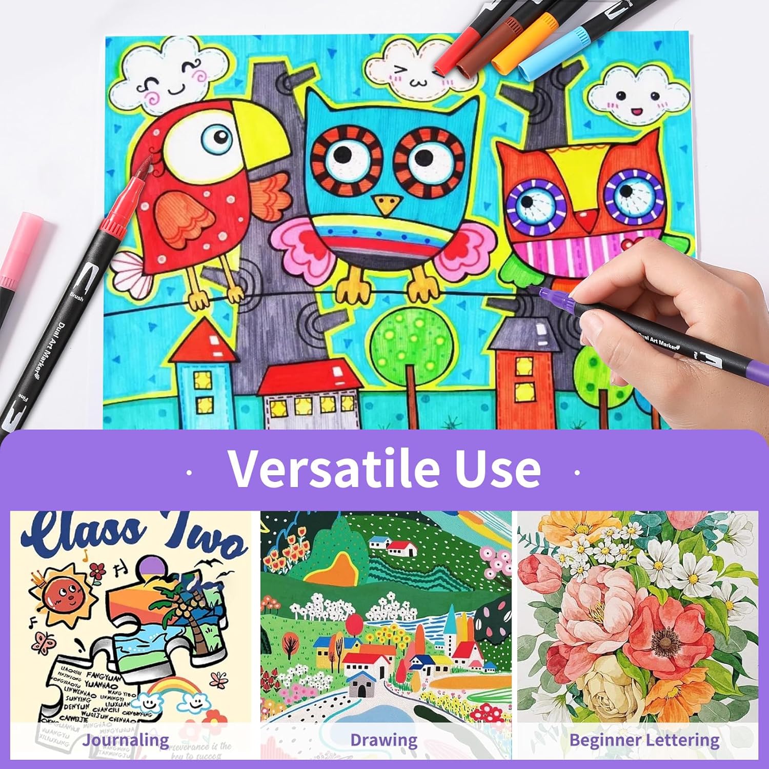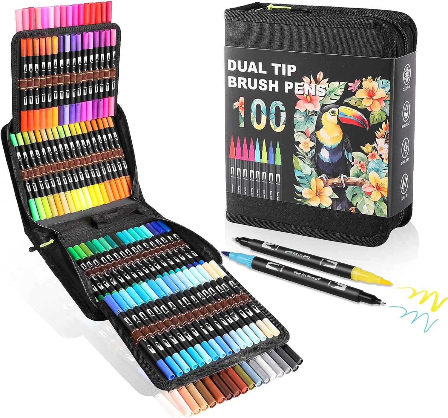 Double Brush Marker Pens, 100 Colors Art Markers Set with Fine Tip and Brush Tip for Kids Adult Coloring Book Hand Lettering Calligraphy Drawing Art Supplies Kit