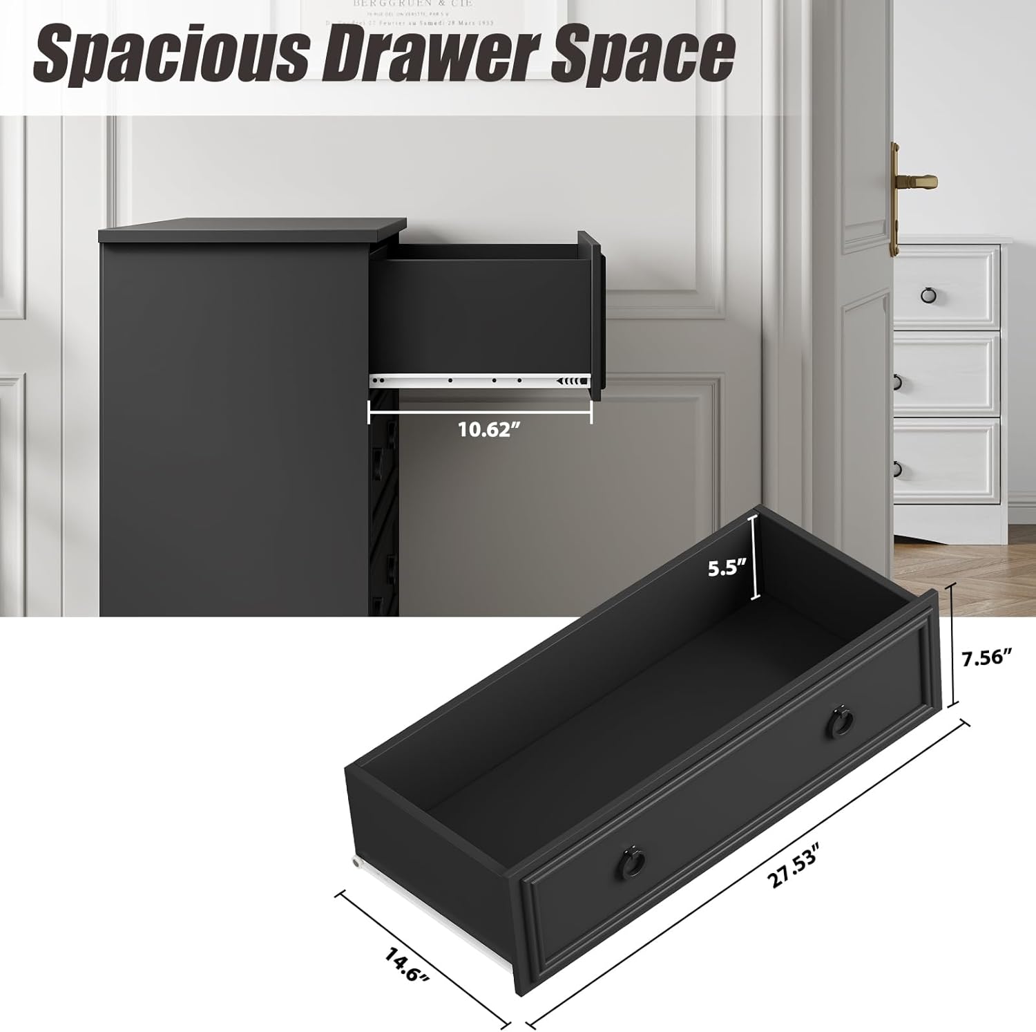 - ăAmple storage spaceă Assembled dimension: 29.53"W x 15.75"D x 35.44"H.This wood dresser is designed with a spacious interior. The drawers won't collide or collapse. And the chest provides an appropriate height to place the potted plant or a lamp.