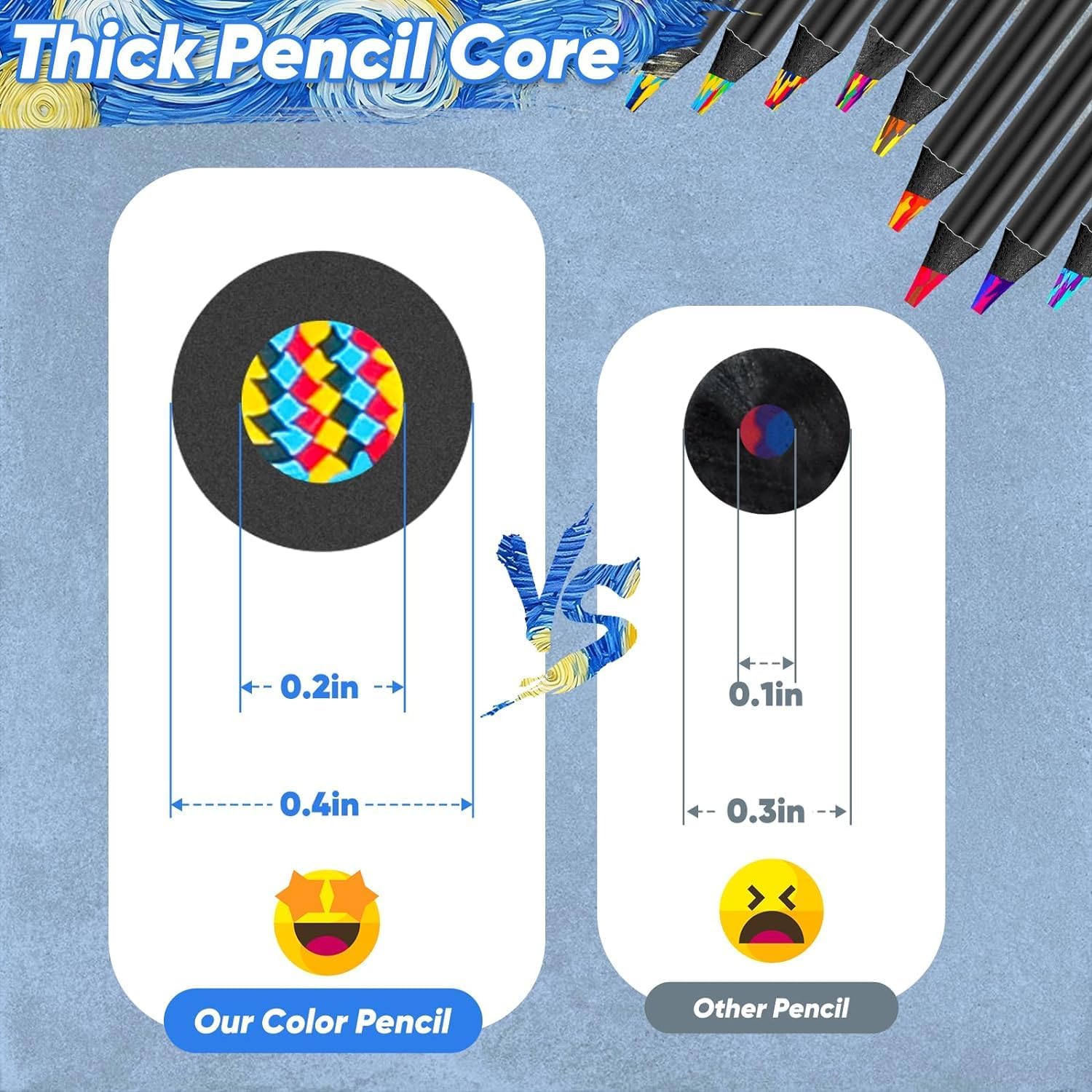 - Jumbo Coloring Pencils: Crafted from resilient ebony wood, our rainbow color pencils stand strong against breakage. Setting them apart from conventional options, these pencils feature a generously thick core, measuring 0.2 inches in diameter, much thicker than others. This enhanced core durability ensures a longer lifespan, while the 0.39-inch broader shaft of the pencil enhances your grip, providing optimal control for your artistic endeavors.