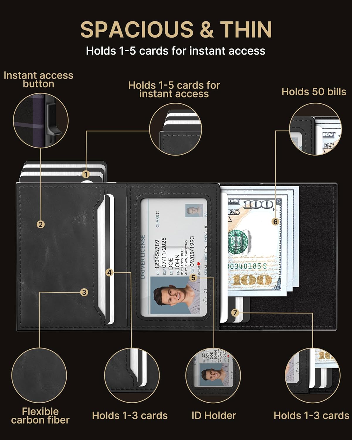 - 【QUICKEST ACCESS】Instant card access at the tap of a button by a single hand. Stores 10-15 cards and 15 bills total. The pop-up aluminum card holder stores 6-7, the built-in cash slot stores 50+ bills, and the ID window for driver's licenses.