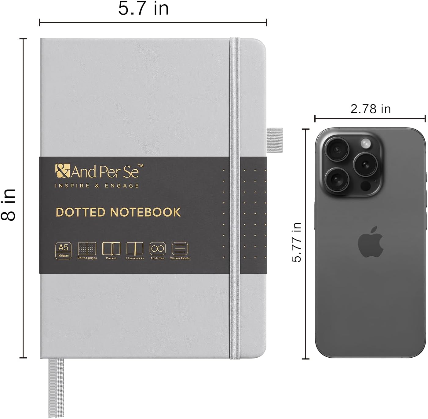 &And Per Se Dotted Journal Notebook, A5 Hardcover Leather Bullet Dotted Journal, 160 Pages 100 gsm Thick Dotted Paper,3 Sheets of Stickers Included - 5.7'' x 8''(Grey)