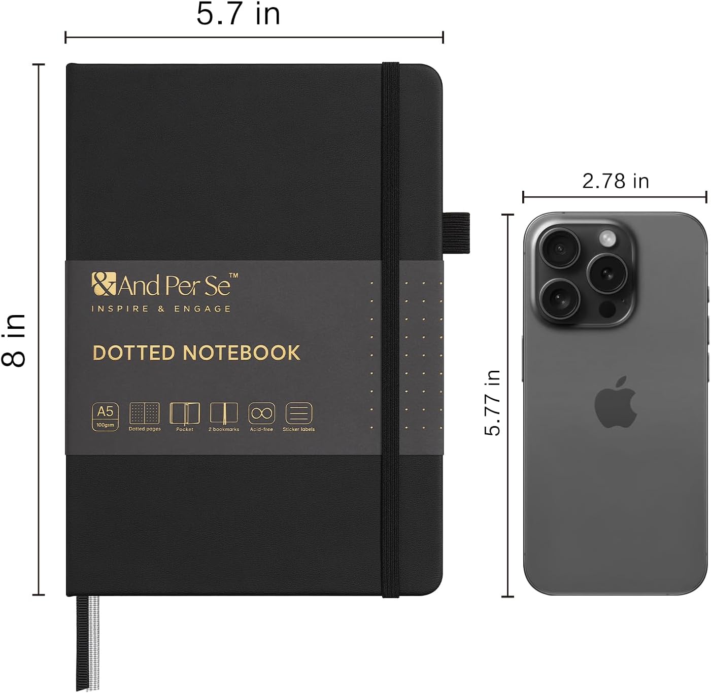 &And Per Se Dotted Journal Notebook, A5 Hardcover Leather Bullet Dotted Journal, 160 Pages 100 gsm Thick Dotted Paper,3 Sheets of Stickers Included (Black)