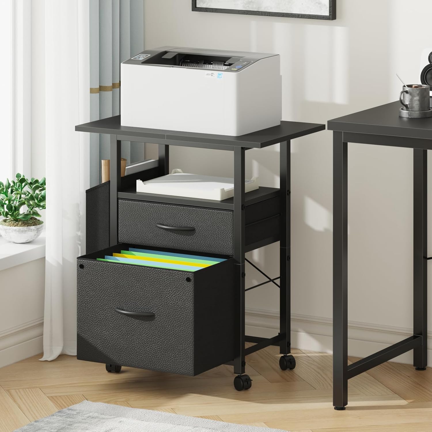 2 Drawer File Cabinet with 24'' Extended Desktop, Mobile Filing Cabinet, Rolling File Cabinet with Side Bag, Fabric Drawer, Fits A4 Size, Home Office, Black