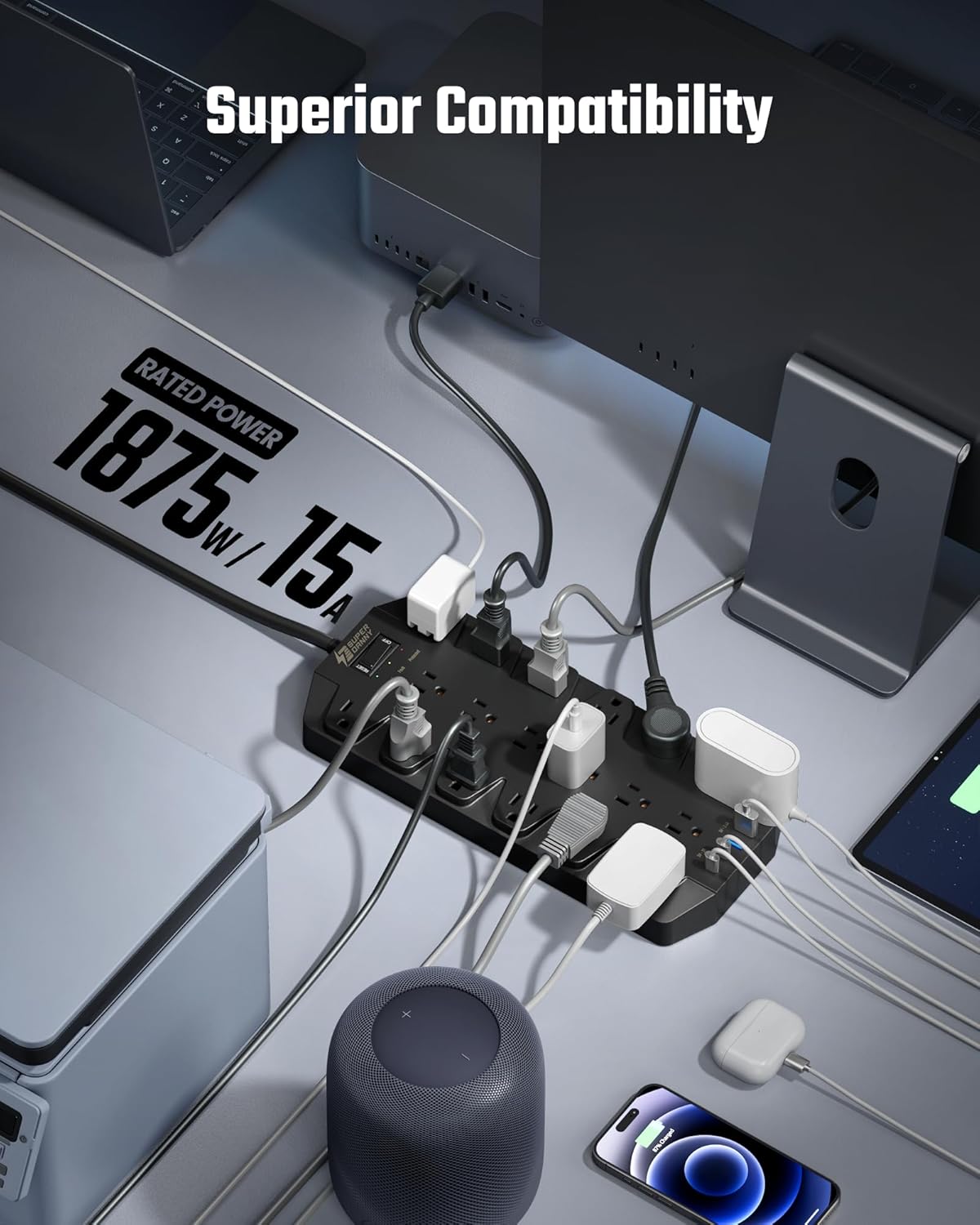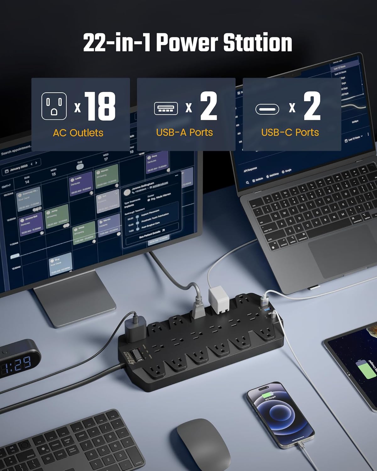 - ă22-in-1 Versatile Power StripăSUPERDANNY heavy duty power strip equipped with 18 AC outlets, 2 USB-A ports, and 2 USB-C ports to gaming room or streaming, office desk, TV, phone, tablet, PC, laptop, and other devices simultaneously.