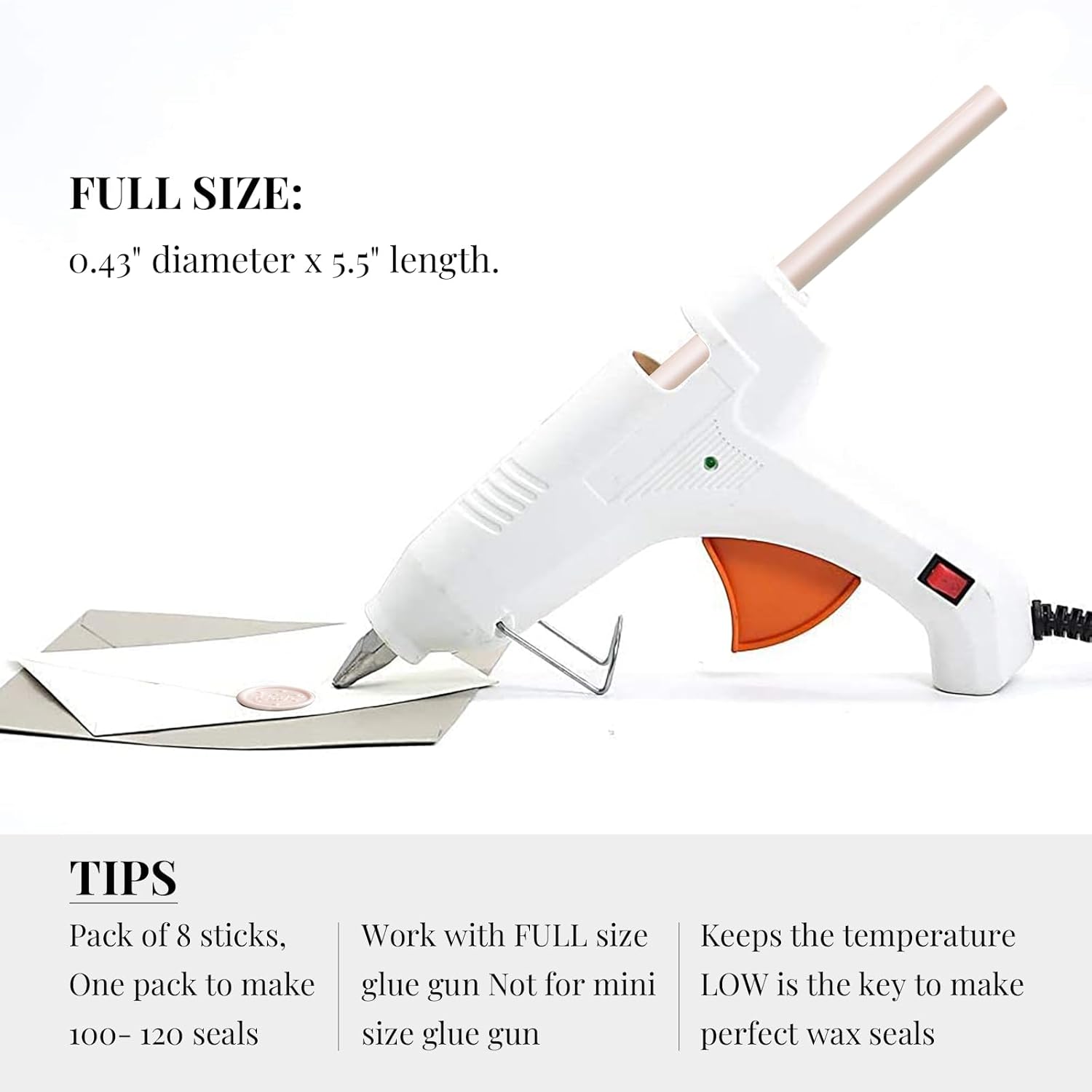- Easy To Apply - Easily use together with a low-temp large standard 0.44" glue gun. Not designed for mini glue guns! If you plan to seal dozens of envelops, this is the most efficient method. To avoid the wax stuck to the stamp, you may put stamp on an ice pack in between every 4-5 impressions. Please remember the glue gun was designed for glue stick which requires a much higer melting temperature than the wax, so to keep the temperature low is the key.